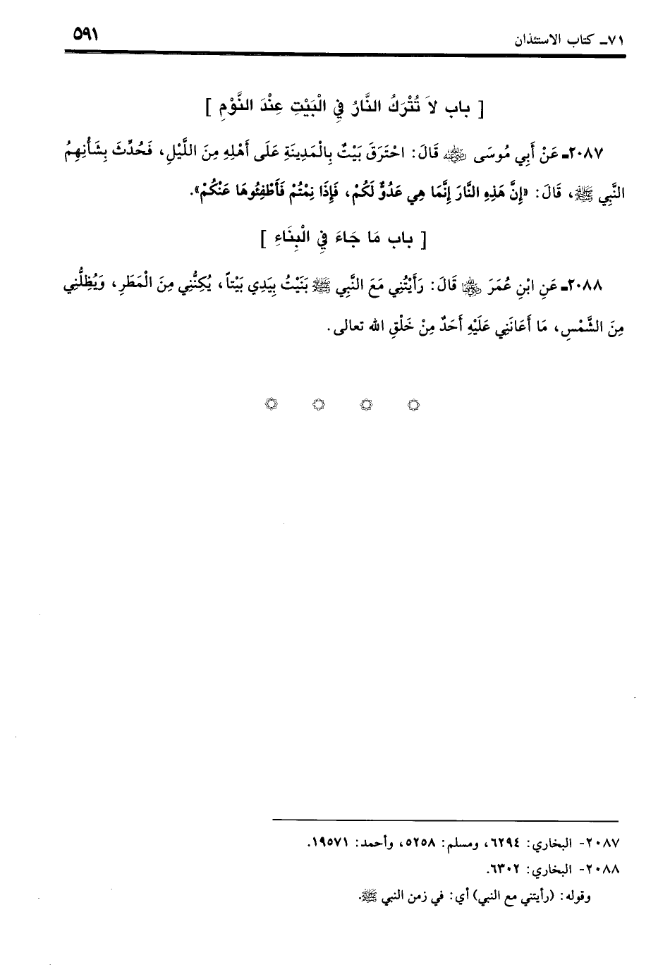 2087 - عَنْ أَبِي مُوسَى - رضي الله عنه - قَالَ: احْتَرَقَ بَيْتٌ بِالْمَدِينَةِ عَلَى أَهْلِهِ مِنَ اللَّيْلِ، فَحُدِّثَ بِشَأْنِهِمُ النَّبِيُّ - صلى الله عليه وسلم -، قَالَ: «إِنَّ هَذِهِ النَّارَ إِنَّمَا هِيَ عَدُوٌّ لَكُمْ، فَإِذَا نِمْتُمْ فَأَطْفِئوهَا عَنْكُمْ». (بخاري: 6294)