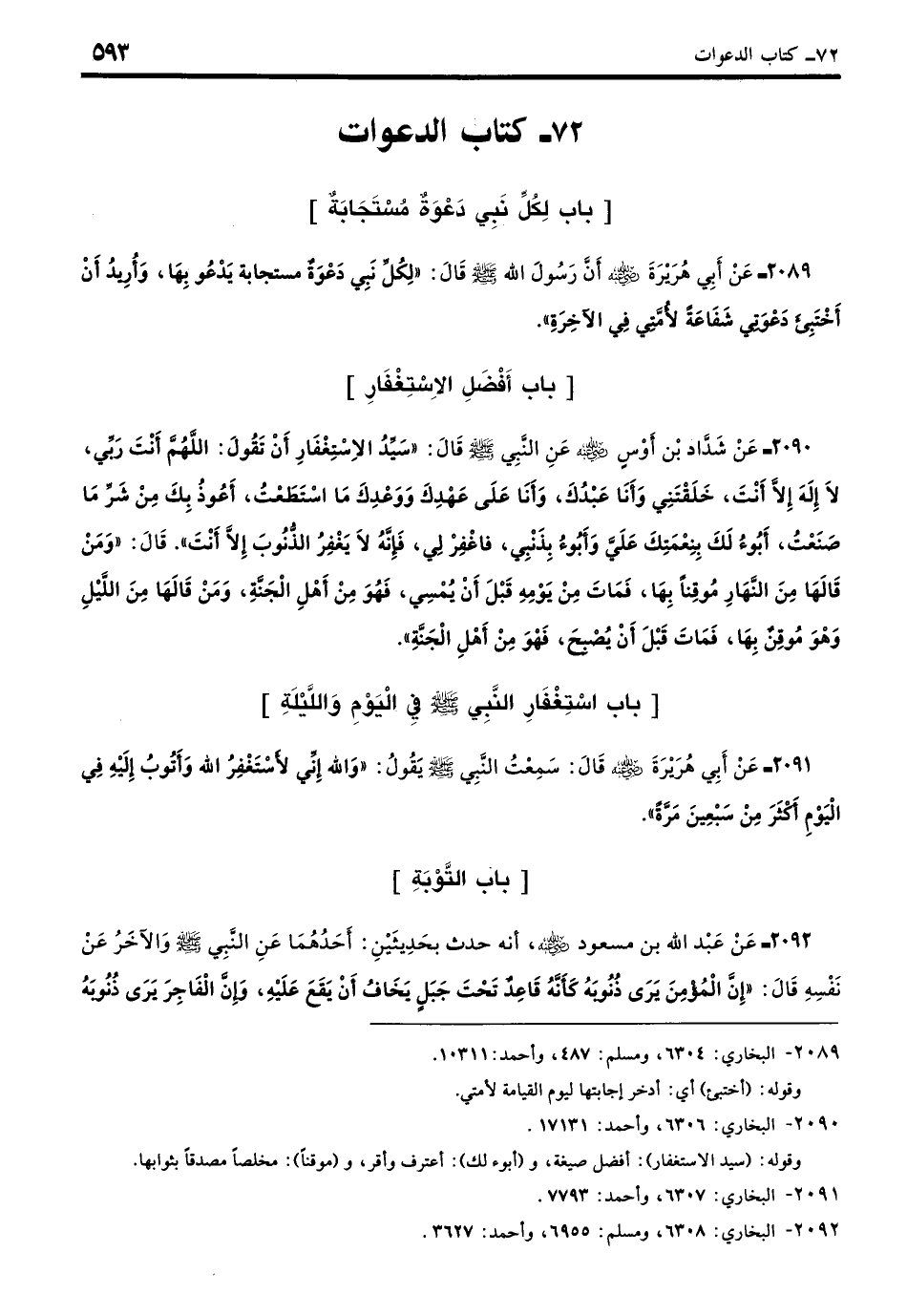 2091 - عَنْ أَبِي هُرَيْرَةَ - رضي الله عنه - قَالَ: سَمِعْتُ رَسُولَ اللَّهِ - صلى الله عليه وسلم - يَقُولُ: «وَاللَّهِ إِنِّي لأَسْتَغْفِرُ اللَّهَ وَأَتُوبُ إِلَيْهِ فِي الْيَوْمِ أَكْثَرَ مِنْ سَبْعِينَ مَرَّةً». (بخاري: 6307)