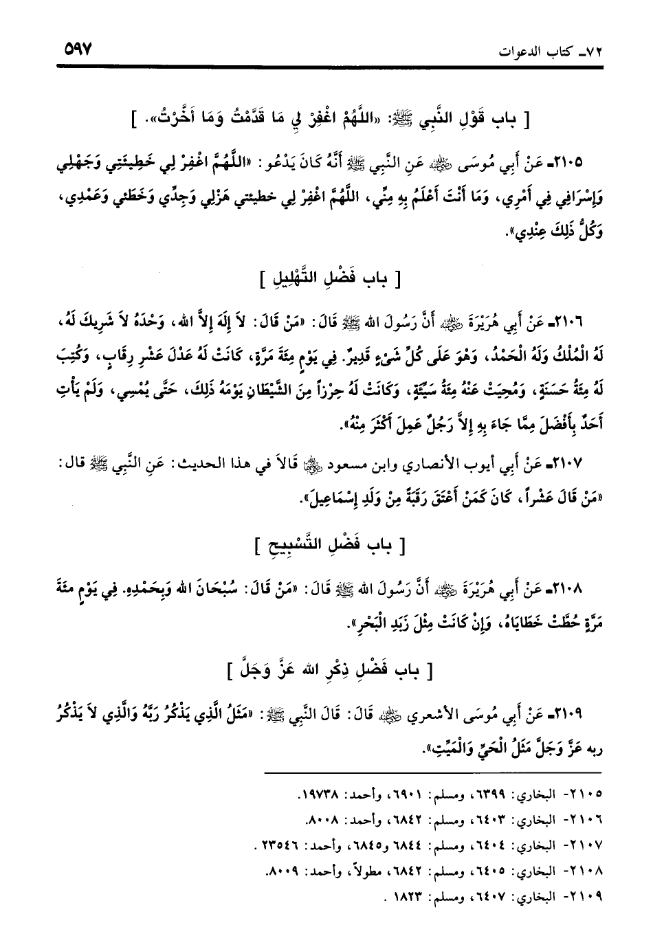 2106 - عَنْ أَبِي هُرَيْرَةَ - رضي الله عنه -: أَنَّ رَسُولَ اللَّهِ - صلى الله عليه وسلم - قَالَ: «مَنْ قَالَ: لَا إِلَهَ إِلَّا اللَّهُ وَحْدَهُ لا شَرِيكَ لَهُ لَهُ الْمُلْكُ وَلَهُ الْحَمْدُ وَهُوَ عَلَى كُلِّ شَيْءٍ قَدِيرٌ، فِي يَوْمٍ مِائةَ مَرَّةٍ، كَانَتْ لَهُ عَدْلَ عَشْرِ رِقَابٍ، وَكُتِبَ لَهُ مِائةُ حَسَنَةٍ، وَمُحِيَتْ عَنْهُ مِائةُ سَيِّئةٍ، وَكَانَتْ لَهُ حِرْزًا مِنَ الشَّيْطَانِ يَوْمَهُ ذَلِكَ حَتَّى يُمْسِيَ، وَلَمْ يَأْتِ أَحَدٌ بِأَفْضَلَ مِمَّا جَاءَ إِلَّا رَجُلٌ عَمِلَ أَكْثَرَ مِنْهُ». (بخاري: 6403)