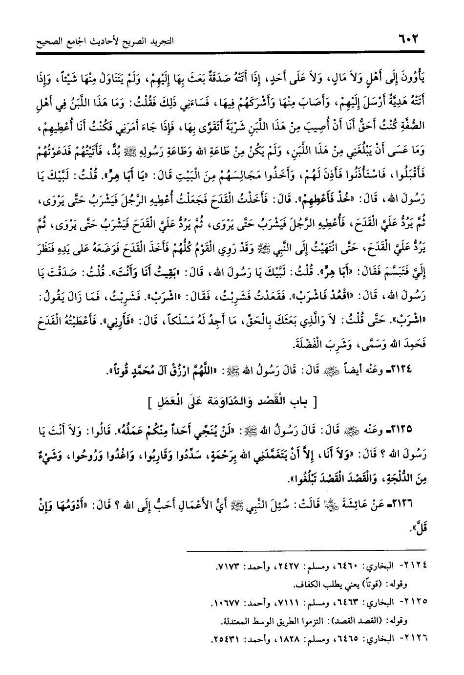 2125 - وَعَنْهُ - رضي الله عنه - قَالَ: قَالَ رَسُولُ اللَّهِ - صلى الله عليه وسلم -: «لَنْ يُنَجِّيَ أَحَدًا مِنْكُمْ عَمَلُهُ». قَالُوا: وَلا أَنْتَ يَا رَسُولَ اللَّهِ؟ قَالَ: «وَلا أَنَا إِلَّا أَنْ يَتَغَمَّدَنِي اللَّهُ بِرَحْمَةٍ. سَدِّدُوا وَقَارِبُوا، وَاغْدُوا وَرُوحُوا، وَشَيْءٌ مِنَ الدُّلْجَةِ، وَالْقَصْدَ الْقَصْدَ تَبْلُغُوا». (بخاري: 6463)