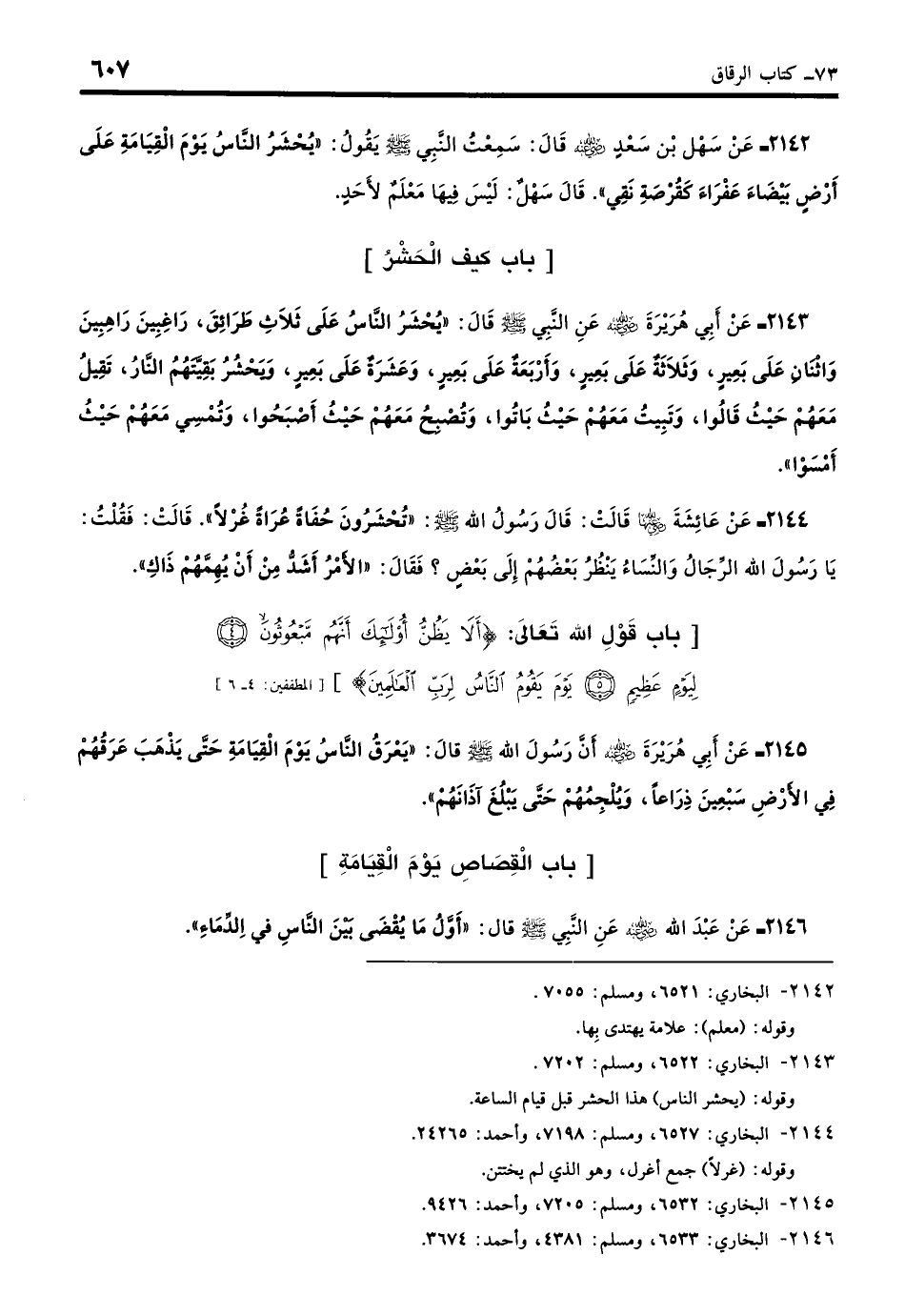 2144 - عَنْ عَائِشَةَ - رضي الله عنها - قَالَتْ: قَالَ رَسُولُ اللَّهِ - صلى الله عليه وسلم -: «تُحْشَرُونَ حُفَاةً عُرَاةً غُرْلًا». قَالَتْ عَائِشَةُ: فَقُلْتُ: يَا رَسُولَ اللَّهِ، الرِّجَالُ وَالنِّسَاءُ يَنْظُرُ بَعْضُهُمْ إِلَى بَعْضٍ؟ فَقَالَ: «الأَمْرُ أَشَدُّ مِنْ أَنْ يُهِمَّهُمْ ذَاكِ». (بخاري: 6527)