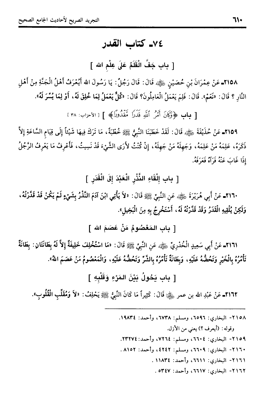 2158 - عَنْ عِمْرَانَ بْنِ حُصَيْنٍ - رضي الله عنه - قَالَ: قَالَ رَجُلٌ: يَا رَسُولَ اللَّهِ، أَيُعْرَفُ أَهْلُ الْجَنَّةِ مِنْ أَهْلِ النَّارِ؟ قَالَ: «نَعَمْ». قَالَ: فَلِمَ يَعْمَلُ الْعَامِلُونَ؟ قَالَ: «كُلٌّ يَعْمَلُ لِمَا خُلِقَ لَهُ، أَوْ لِمَا يُسِّرَ لَهُ». (بخاري: 6596)