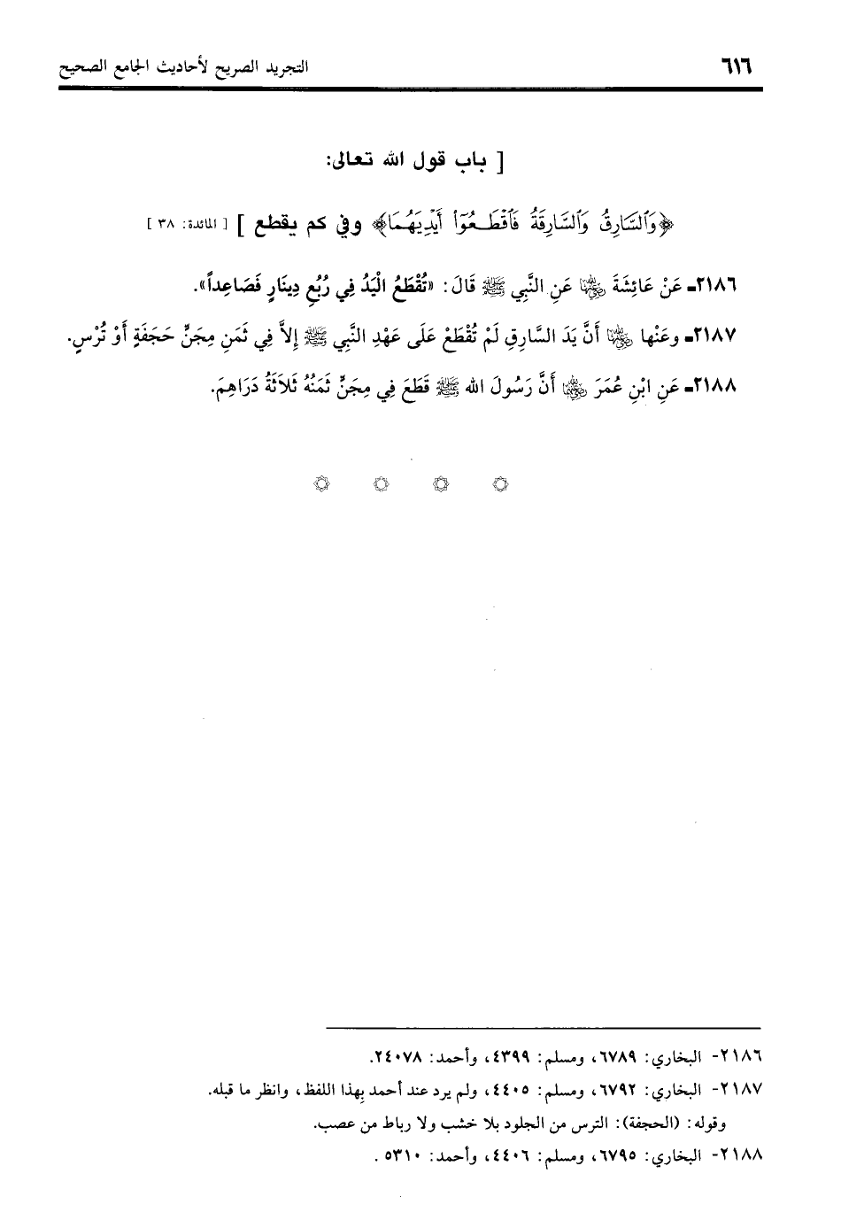 2186 - عَنْ عَائِشَةَ - رضي الله عنها - عَنِ النَّبِيِّ - صلى الله عليه وسلم - قَالَ: «تُقْطَعُ الْيَدُ فِي رُبُعِ دِينَارٍ فَصَاعِدًا». (بخاري: 6789)