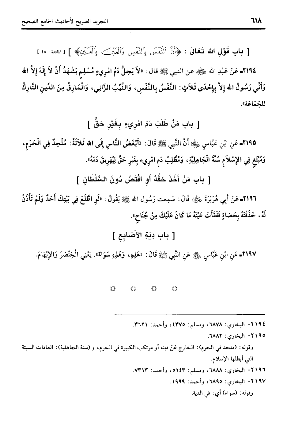 2194 - عَنْ عَبْدِ اللَّهِ - رضي الله عنه - قَالَ: قَالَ رَسُولُ اللَّهِ - صلى الله عليه وسلم -: «لا يَحِلُّ دَمُ امْرِئ مُسْلِمٍ يَشْهَدُ أَنْ لَا إِلَهَ إِلَّا اللَّهُ وَأَنِّي رَسُولُ اللَّهِ إِلَّا بِإِحْدَى ثَلاثٍ: النَّفْسُ بِالنَّفْسِ، وَالثَّيِّبُ الزَّانِي، وَالْمَارِقُ مِنَ الدِّينِ التَّارِكُ لِلْجَمَاعَةِ». (بخاري: 6878)