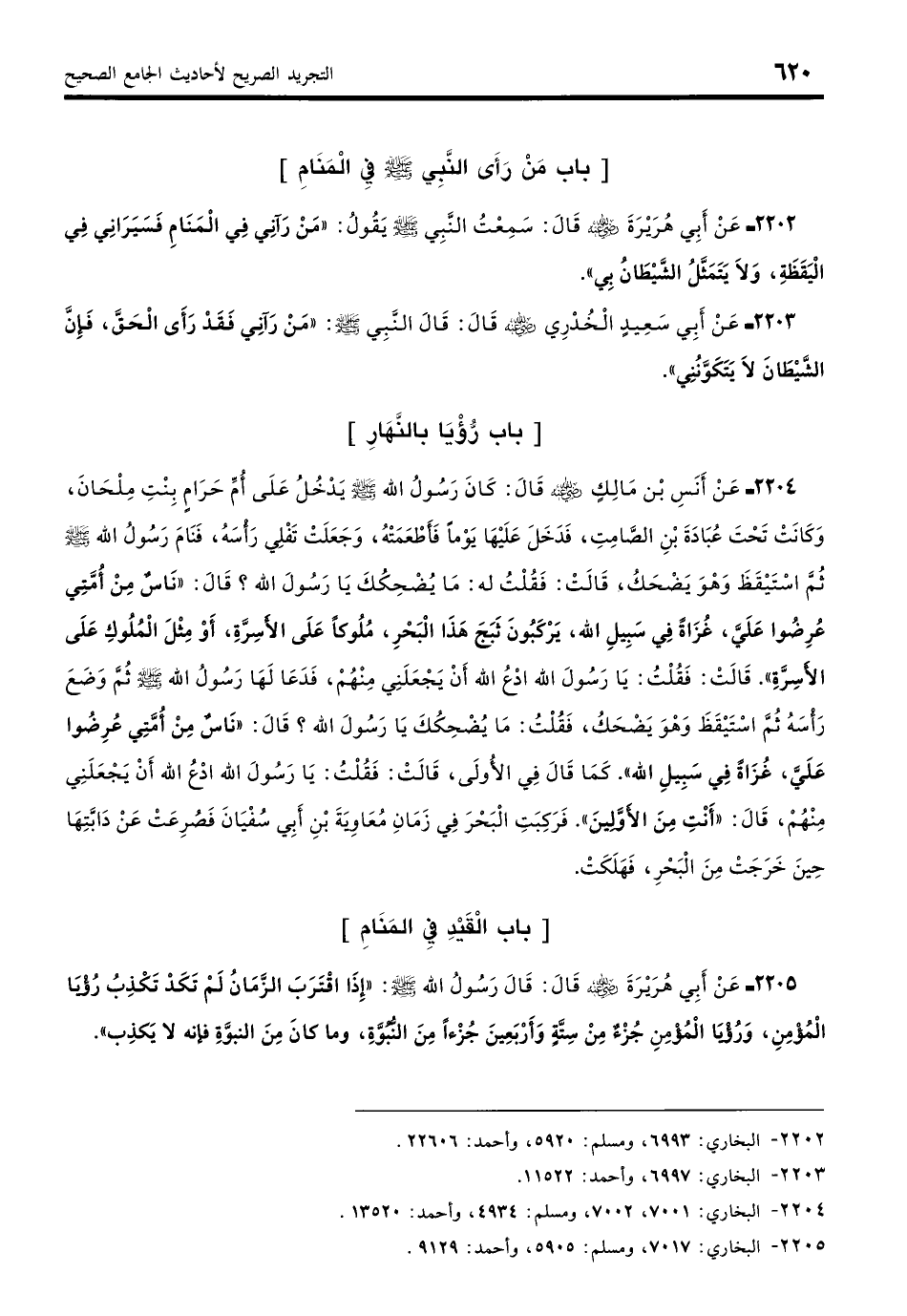 2204 - عَنْ أَنَسِ بْنَ مَالِكٍ - رضي الله عنه - يَقُولُ: كَانَ رَسُولُ اللَّهِ - صلى الله عليه وسلم - يَدْخُلُ عَلَى أُمِّ حَرَامٍ بِنْتِ مِلْحَانَ، وَكَانَتْ تَحْتَ عُبَادَةَ بْنِ الصَّامِتِ، فَدَخَلَ عَلَيْهَا يَوْمًا فَأَطْعَمَتْهُ وَجَعَلَتْ تَفْلِي رَأْسَهُ، فَنَامَ رَسُولُ اللَّهِ - صلى الله عليه وسلم -، ثُمَّ اسْتَيْقَظَ وَهُوَ يَضْحَكُ، قَالَتْ: فَقُلْتُ: مَا يُضْحِكُكَ يَا رَسُولَ اللَّهِ؟ قَالَ: «نَاسٌ مِنْ أُمَّتِي عُرِضُوا عَلَيَّ غُزَاةً فِي سَبِيلِ اللَّهِ، يَرْكَبُونَ ثَبَجَ هَذَا الْبَحْرِ مُلُوكًا عَلَى الأَسِرَّةِ - أَوْ مِثْلَ الْمُلُوكِ عَلَى الأَسِرَّةِ». قَالَتْ: فَقُلْتُ: يَا رَسُولَ اللَّهِ، ادْعُ اللَّهَ أَنْ يَجْعَلَنِي مِنْهُمْ، فَدَعَا لَهَا رَسُولُ اللَّهِ - صلى الله عليه وسلم -، ثُمَّ وَضَعَ رَأْسَهُ، ثُمَّ اسْتَيْقَظَ وَهُوَ يَضْحَكُ، فَقُلْتُ: مَا يُضْحِكُكَ يَا رَسُولَ اللَّهِ؟ قَالَ: «نَاسٌ مِنْ أُمَّتِي عُرِضُوا عَلَيَّ غُزَاةً فِي سَبِيلِ اللَّهِ» كَمَا قَالَ فِي الأُولَى. قَالَتْ: فَقُلْتُ: يَا رَسُولَ اللَّهِ، ادْعُ اللَّهَ أَنْ يَجْعَلَنِي مِنْهُمْ، قَالَ: «أَنْتِ مِنَ الأَوَّلِينَ». فَرَكِبَتِ الْبَحْرَ فِي زَمَانِ مُعَاوِيَةَ بْنِ أَبِي سُفْيَانَ فَصُرِعَتْ عَنْ دَابَّتِهَا حِينَ خَرَجَتْ مِنَ الْبَحْرِ، فَهَلَكَتْ. (بخاري: 7002)