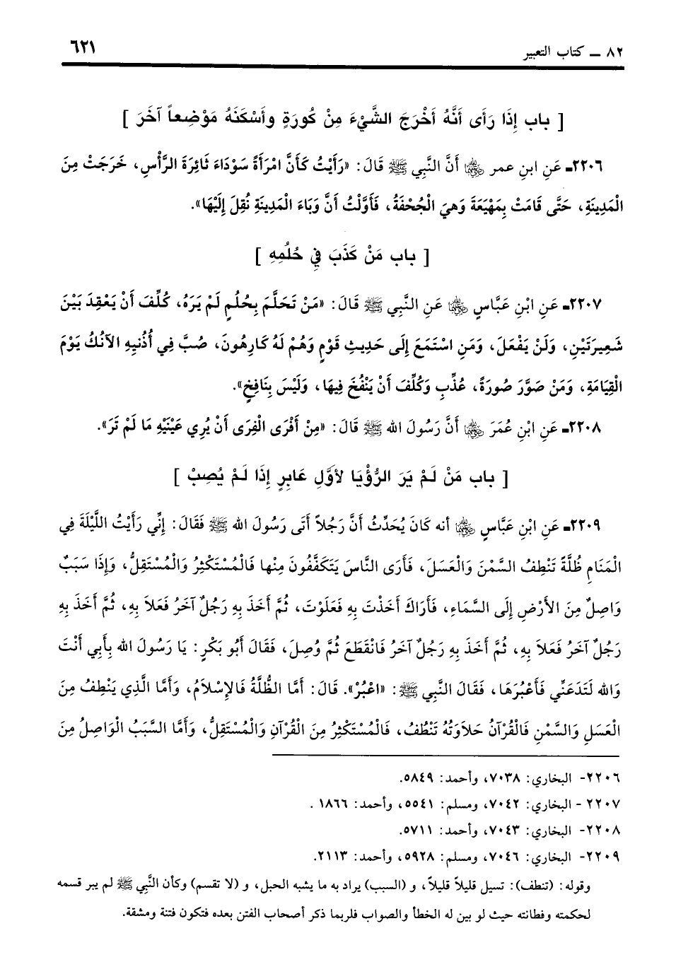 2209 - عَنِ ابْنِ عَبَّاسٍ - رضي الله عنهما - كَانَ يُحَدِّثُ: أَنَّ رَجُلًا أَتَى رَسُولَ اللَّهِ - صلى الله عليه وسلم - فَقَالَ: إِنِّي رَأَيْتُ اللَّيْلَةَ فِي الْمَنَامِ ظُلَّةً تَنْطُفُ السَّمْنَ وَالْعَسَلَ، فَأَرَى النَّاسَ يَتَكَفَّفُونَ مِنْهَا، فَالْمُسْتَكْثِرُ وَالْمُسْتَقِلُّ، وَإِذَا سَبَبٌ وَاصِلٌ مِنَ الأَرْضِ إِلَى السَّمَاءِ، فَأَرَاكَ أَخَذْتَ بِهِ فَعَلَوْتَ، ثُمَّ أَخَذَ بِهِ رَجُلٌ آخَرُ فَعَلا بِهِ، ثُمَّ أَخَذَ بِهِ رَجُلٌ آخَرُ فَعَلا بِهِ، ثُمَّ أَخَذَ بِهِ رَجُلٌ آخَرُ فَانْقَطَعَ، ثُمَّ وُصِلَ، فَقَالَ أَبُو بَكْرٍ: يَا رَسُولَ اللَّهِ، بِأَبِي أَنْتَ، وَاللَّهِ لَتَدَعَنِّي فَأَعْبُرَهَا، فَقَالَ النَّبِيُّ - صلى الله عليه وسلم -: «اعْبُرْ». قَالَ: أَمَّا الظُّلَّةُ فَالإِسْلامُ، وَأَمَّا الَّذِي يَنْطُفُ مِنَ الْعَسَلِ وَالسَّمْنِ فَالْقُرْآنُ حَلاوَتُهُ تَنْطُفُ، فَالْمُسْتَكْثِرُ مِنَ الْقُرْآنِ وَالْمُسْتَقِلُّ، وَأَمَّا السَّبَبُ الْوَاصِلُ مِنَ