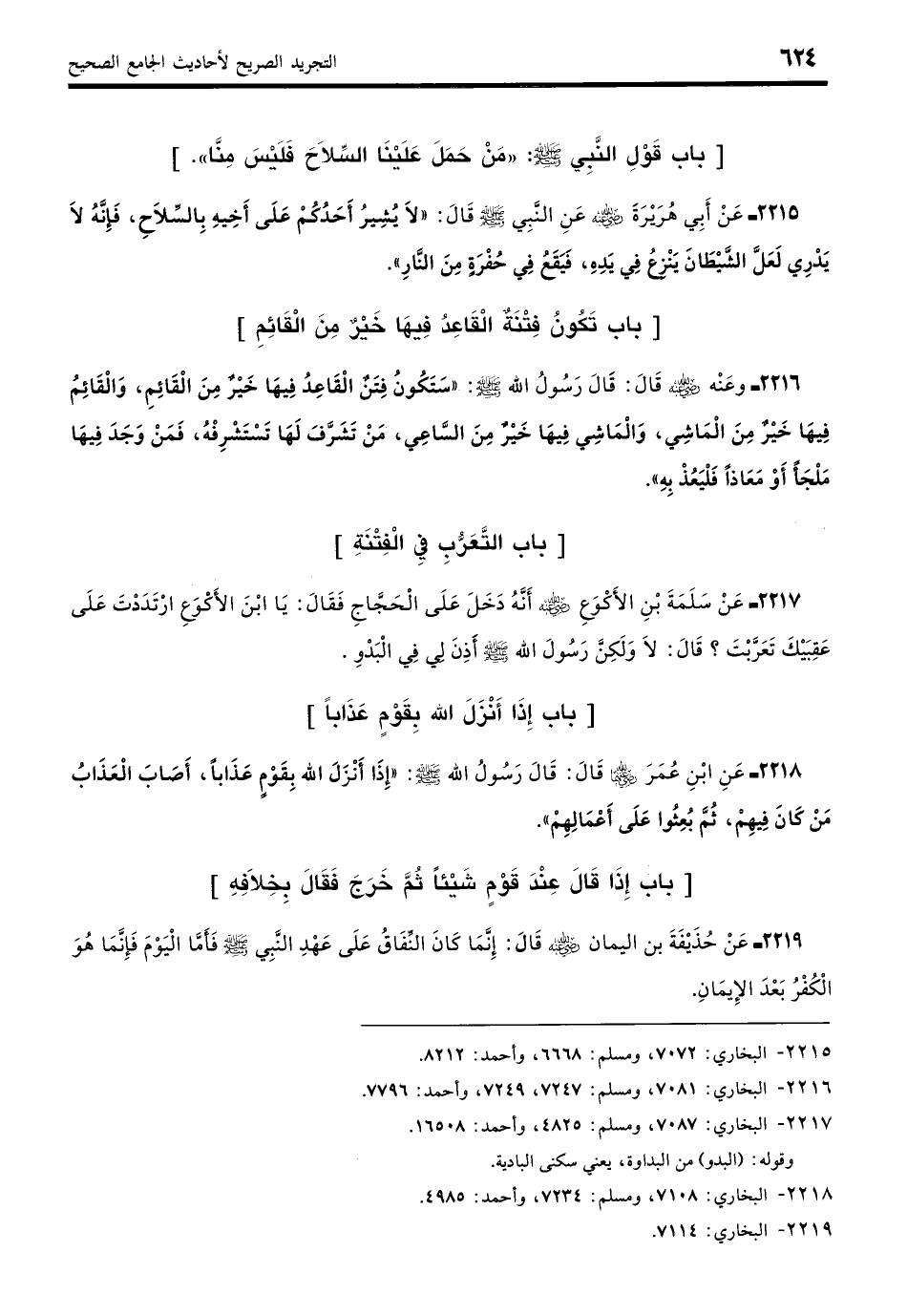 2216 - وَعَنْهُ - رضي الله عنه - قَالَ: قَالَ رَسُولُ اللَّهِ - صلى الله عليه وسلم -: «سَتَكُونُ فِتَنٌ الْقَاعِدُ فِيهَا خَيْرٌ مِنَ الْقَائمِ، وَالْقَائمُ فِيهَا خَيْرٌ مِنَ الْمَاشِي، وَالْمَاشِي فِيهَا خَيْرٌ مِنَ السَّاعِي، مَنْ تَشَرَّفَ لَهَا تَسْتَشْرِفْهُ، فَمَنْ وَجَدَ مِنْهَا مَلْجَأً أَوْ مَعَاذًا فَلْيَعُذْ بِهِ». (بخاري: 7081)