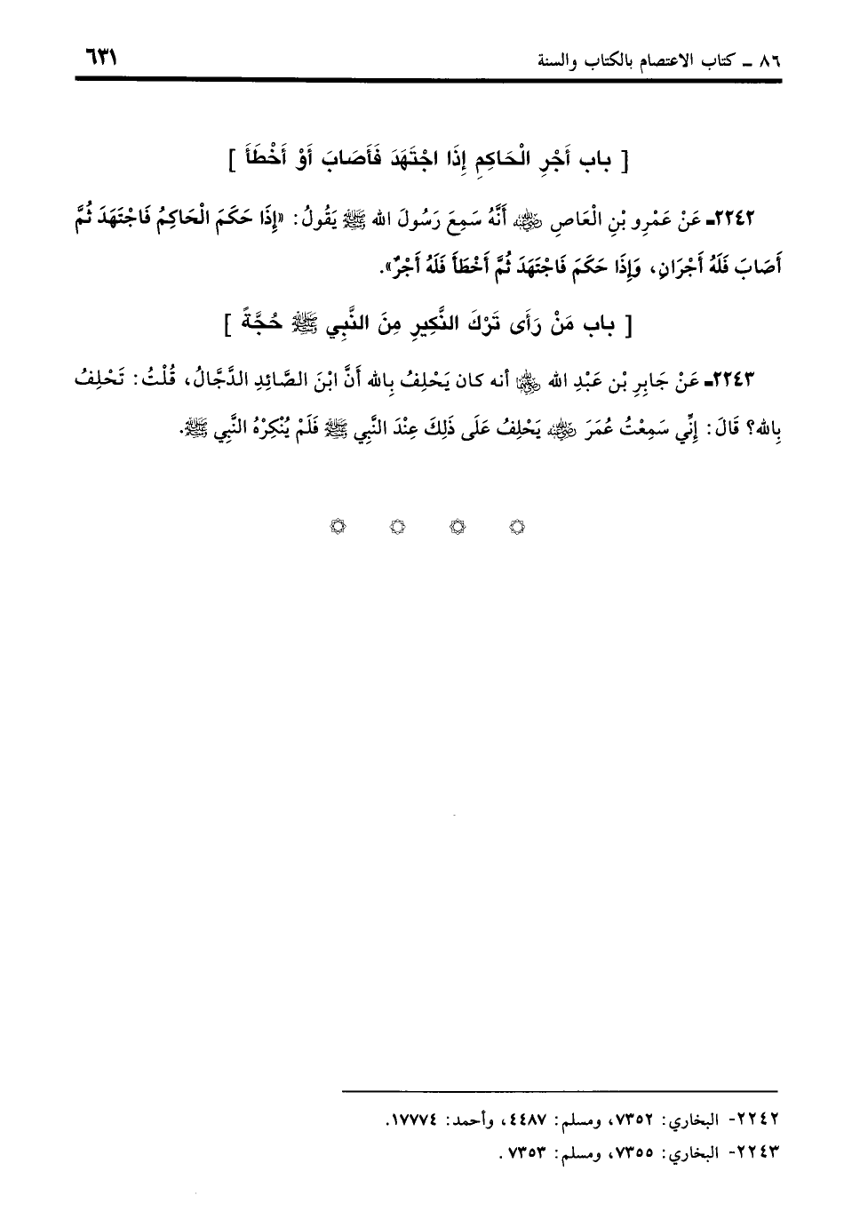 2242 - عَنْ عَمْرِو بْنِ الْعَاصِ - رضي الله عنه -: أَنَّهُ سَمِعَ رَسُولَ اللَّهِ - صلى الله عليه وسلم - يَقُولُ: «إِذَا حَكَمَ الْحَاكِمُ فَاجْتَهَدَ ثُمَّ أَصَابَ فَلَهُ أَجْرَانِ، وَإِذَا حَكَمَ فَاجْتَهَدَ ثُمَّ أَخْطَأَ فَلَهُ أَجْرٌ». (بخاري: 7352)