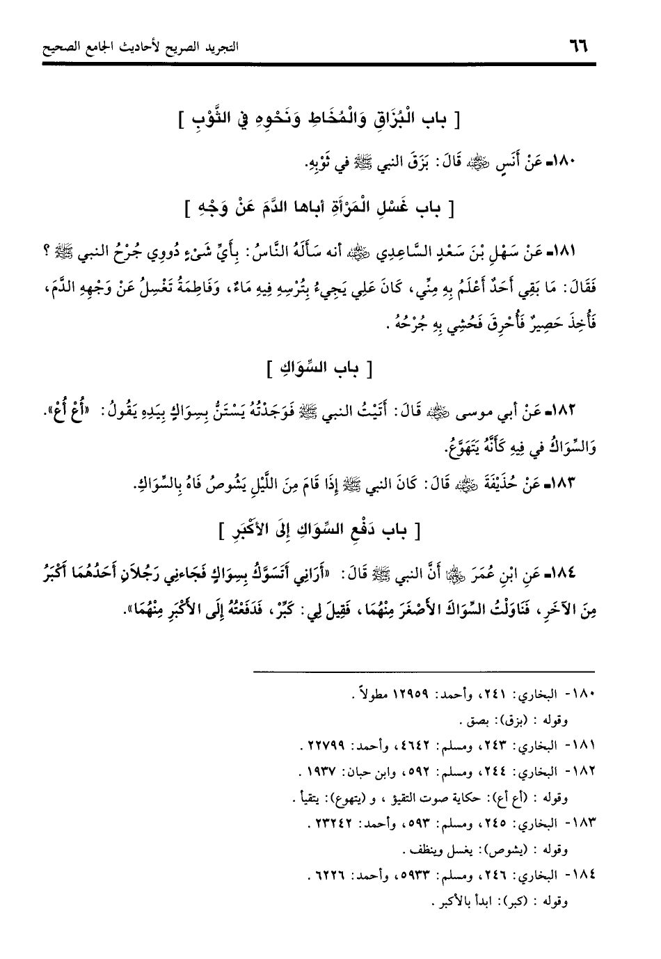 180 - عَنْ أَنَسِ بْنِ مَالِكٍ - رضي الله عنه - قَالَ: بَزَقَ النَّبِيُّ - صلى الله عليه وسلم - فِي ثَوْبِهِ. (بخاري: 241)