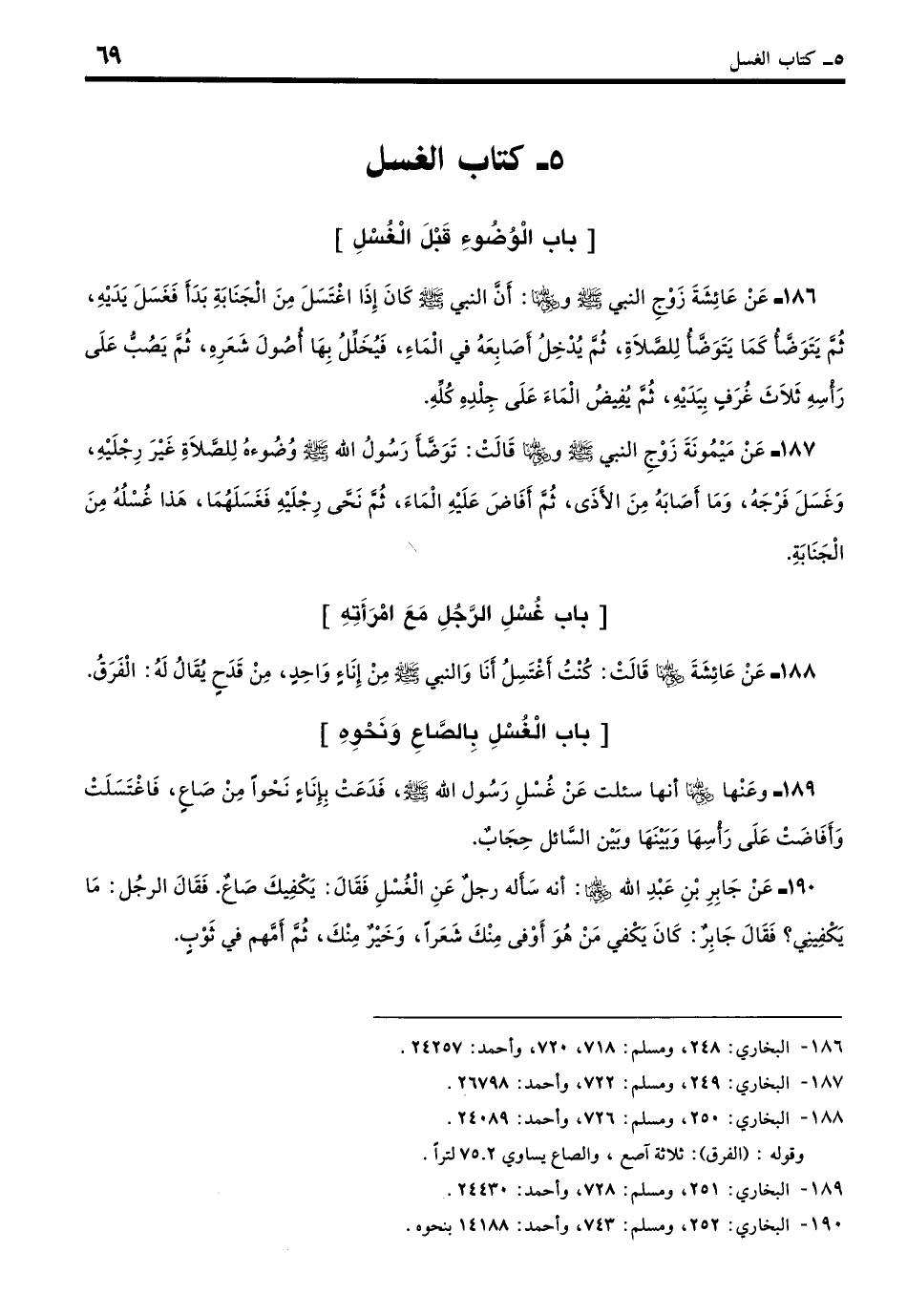 189 - وَعَنْهَا - رضي الله عنها -: أَنَّهَا سُئِلَت عَنْ غُسْلِ النَّبِيِّ - صلى الله عليه وسلم -، فَدَعَتْ بِإِنَاءٍ نَحْوًا مِنْ صَاعٍ فَاغْتَسَلَتْ وَأَفَاضَتْ عَلَى رَأْسِهَا، وَبَيْنَهَا وَبَيْنَ السَّائِلِ حِجَابٌ. (بخاري: 251)