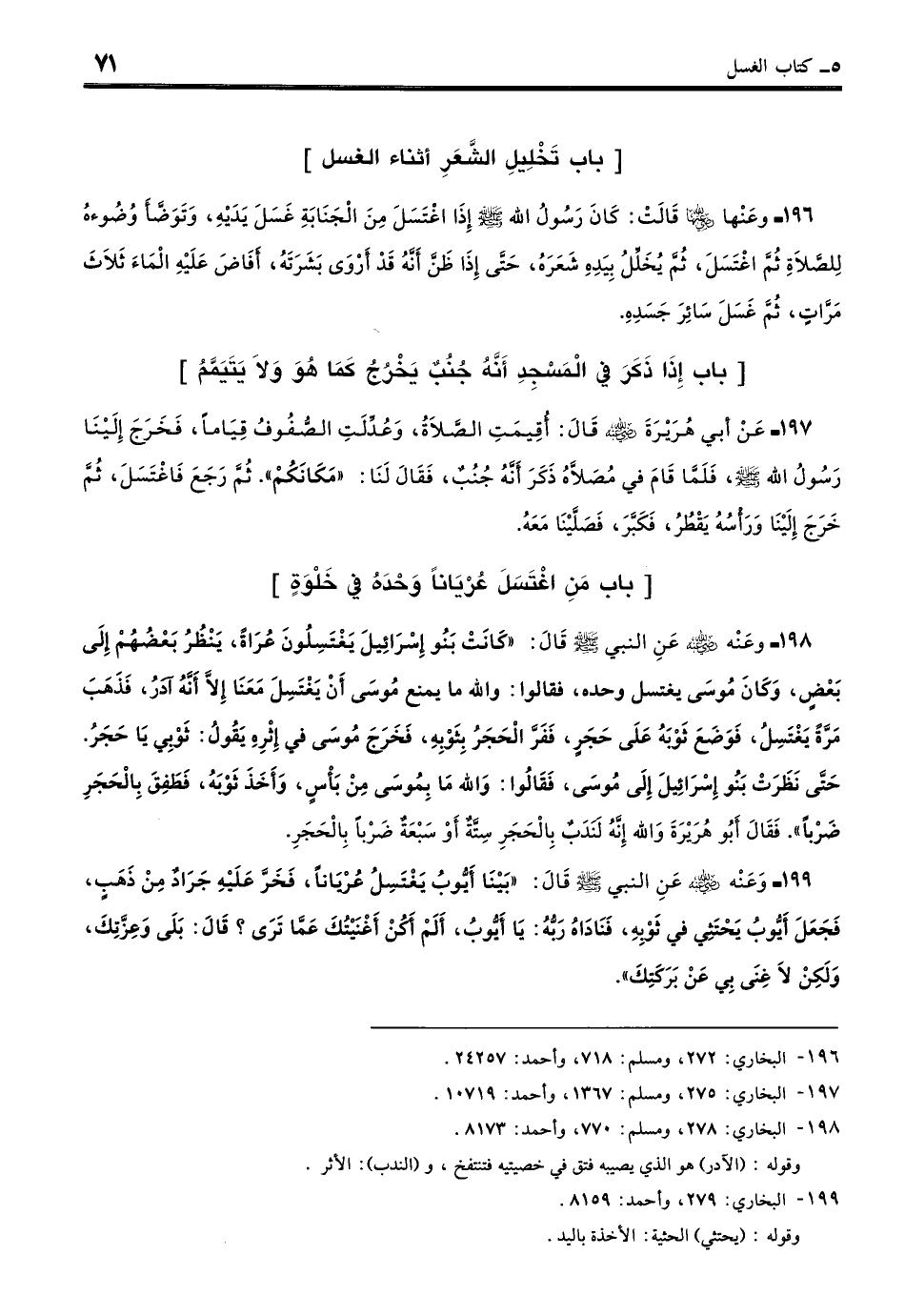 198 - عَنْ أَبِي هُرَيْرَةَ - رضي الله عنه - عَنِ النَّبِيِّ - صلى الله عليه وسلم - قَالَ: «كَانَتْ بَنُو إِسْرَائِيلَ يَغْتَسِلُونَ عُرَاةً يَنْظُرُ بَعْضُهُمْ إِلَى بَعْضٍ، وَكَانَ مُوسَى - صلى الله عليه وسلم - يَغْتَسِلُ وَحْدَهُ فَقَالُوا: وَاللَّهِ مَا يَمْنَعُ مُوسَى أَنْ يَغْتَسِلَ مَعَنَا إِلا أَنَّهُ آدَرُ، فَذَهَبَ مَرَّةً يَغْتَسِلُ، فَوَضَعَ ثَوْبَهُ عَلَى حَجَرٍ فَفَرَّ الْحَجَرُ بِثَوْبِهِ فَخَرَجَ مُوسَى فِي إِثْرِهِ يَقُولُ: ثَوْبِي يَا حَجَرُ، حَتَّى نَظَرَتْ بَنُو إِسْرَائِيلَ إِلَى مُوسَى، فَقَالُوا: وَاللَّهِ مَا بِمُوسَى مِنْ بَأْسٍ، وَأَخَذَ ثَوْبَهُ، فَطَفِقَ بِالْحَجَرِ ضَرْبًا». فَقَالَ: أَبُو هُرَيْرَةَ: وَاللَّهِ إِنَّهُ لَنَدَبٌ بِالْحَجَرِ، سِتَّةٌ أَوْ سَبْعَةٌ ضَرْبًا بِالْحَجَرِ. (بخاري: 278)