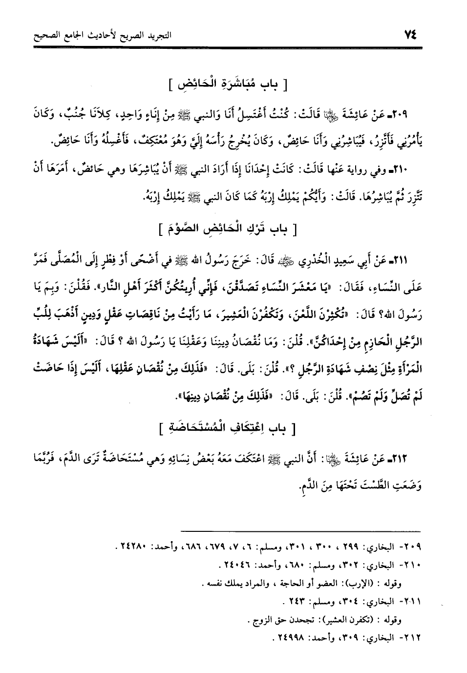 210 - وَفِيْ رِوَايَةٍ عَنْهَا - رضي الله عنها - قَالَتْ: كَانَتْ إِحْدَانَا إِذَا كَانَتْ حَائِضًا فَأَرَادَ رَسُولُ اللَّهِ - صلى الله عليه وسلم - أَنْ يُبَاشِرَهَا أَمَرَهَا أَنْ تَتَّزِرَ فِي فَوْرِ حَيْضَتِهَا ثُمَّ يُبَاشِرُهَا، قَالَتْ: وَأَيُّكُمْ يَمْلِكُ إِرْبَهُ كَمَا كَانَ النَّبِيُّ - صلى الله عليه وسلم - يَمْلِكُ إِرْبَهُ. (بخاري: 302)