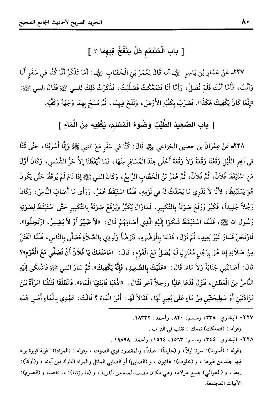 227 - عَنْ عَمَّارِ بْنِ يَاسِرٍ أنَّه قَالَ لِعُمَرَ بْنِ الْخَطَّابِ - رضي الله عنه -: أَمَا تَذْكُرُ أَنَّا كُنَّا فِي سَفَرٍ أَنَا وَأَنْتَ، فَأَمَّا أَنْتَ فَلَمْ تُصَلِّ وَأَمَّا أَنَا فَتَمَعَّكْتُ فَصَلَّيْتُ، فَذَكَرْتُ لِلنَّبِيِّ - صلى الله عليه وسلم -، فَقَالَ النَّبِيُّ - صلى الله عليه وسلم -: «إِنَّمَا كَانَ يَكْفِيكَ هَكَذَا». فَضَرَبَ النَّبِيُّ - صلى الله عليه وسلم - بِكَفَّيْهِ الأَرْضَ وَنَفَخَ فِيهِمَا ثُمَّ مَسَحَ بِهِمَا وَجْهَهُ وَكَفَّيْهِ؟ (بخاري: 338)