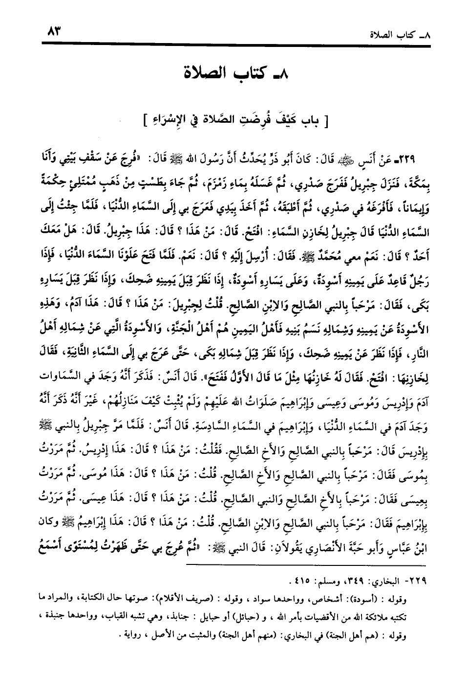 229 - عَنْ أَنَسِ بْنِ مَالِكٍ - رضي الله عنه - قَالَ: كَانَ أَبُو ذَرٍّ - رضي الله عنه - يُحَدِّثُ أَنَّ رَسُولَ اللَّهِ - صلى الله عليه وسلم - قَالَ: «فُرِجَ عَنْ سَقْفِ بَيْتِي وَأَنَا بِمَكَّةَ، فَنَزَلَ جِبْرِيلُ فَفَرَجَ صَدْرِي ثُمَّ غَسَلَهُ بِمَاءِ زَمْزَمَ، ثُمَّ جَاءَ بِطَسْتٍ مِنْ ذَهَبٍ مُمْتَلِئٍ حِكْمَةً وَإِيمَانًا فَأَفْرَغَهُ فِي صَدْرِي ثُمَّ أَطْبَقَهُ، ثُمَّ أَخَذَ بِيَدِي فَعَرَجَ بِي إِلَى السَّمَاءِ الدُّنْيَا، فَلَمَّا جِئْتُ إِلَى السَّمَاءِ الدُّنْيَا، قَالَ جِبْرِيلُ لِخَازِنِ السَّمَاءِ: افْتَحْ. قَالَ: مَنْ هَذَا؟ قَالَ: هَذَا جِبْرِيلُ، قالَ: هَلْ مَعَكَ أَحَدٌ؟ قَالَ: نَعَمْ، مَعِي مُحَمَّدٌ - صلى الله عليه وسلم -، فَقَالَ: أُرْسِلَ إِلَيْهِ؟ قَالَ: نَعَمْ، فَلَمَّا فَتَحَ عَلَوْنَا السَّمَاءَ الدُّنْيَا، فَإِذَا رَجُلٌ قَاعِدٌ عَلَى يَمِينِهِ أَسْوِدَةٌ وَعَلَى يَسَارِهِ أَسْوِدَةٌ، إِذَا نَظَرَ قِبَلَ يَمِينِهِ ضَحِكَ، وَإِذَا نَظَرَ قِبَلَ يَسَارِهِ بَكَى، فَقَالَ: مَرْحَبًا بِالنَّبِيِّ الصَّالِحِ وَالابْنِ الصَّالِحِ، قُلْتُ لِجِبْرِيلَ: مَنْ هَذَا؟ قَال: هَذَا آدَمُ وَهَذِهِ الأَسْوِدَةُ عَنْ يَمِينِهِ وَشِمَالِهِ نَسَمُ بَنِيهِ، فَأَهْلُ الْيَمِينِ مِنْهُمْ أَهْلُ الْجَنَّةِ، وَالأَسْوِدَةُ الَّتِي عَنْ شِمَالِهِ أَهْلُ النَّارِ، فَإِذَا نَظَرَ عَنْ يَمِينِهِ ضَحِكَ وَإِذَا نَظَرَ قِبَلَ شِمَالِهِ بَكَى، حَتَّى عَرَجَ بِي إِلَى السَّمَاءِ الثَّانِيَةِ، فَقَالَ لِخَازِنِهَا: افْتَحْ، فَقَالَ لَهُ خَازِنِهَا مِثْلَ مَا قَالَ الأَوَّلُ، فَفَتَحَ»، قَالَ أَنَسٌ: فَذَكَرَ أَنَّهُ وَجَدَ فِي السَّمَوَاتِ آدَمَ وَإِدْرِيسَ وَمُوسَى وَعِيسَى وَإِبْرَاهِيمَ صَلَوَاتُ اللَّهِ عَلَيْهِمْ، وَلَمْ يُثْبِتْ كَيْفَ مَنَازِلُهُمْ، غَيْرَ أَنَّهُ ذَكَرَ أَنَّهُ وَجَدَ آدَمَ فِي السَّمَاءِ الدُّنْيَا، وَإِبْرَاهِيمَ فِي السَّمَاءِ السَّادِسَةِ، قَالَ أَنَسٌ: فَلَمَّا مَرَّ جِبْرِيلُ بِالنَّبِيِّ - صلى الله عليه وسلم - بِإِدْرِيسَ، قَالَ: مَرْحَبًا بِالنَّبِيِّ الصَّالِحِ وَالأَخِ الصَّالِحِ، فَقُلْتُ: مَنْ هَذَا؟ قَالَ: هَذَا إِدْرِيسُ، ثُمَّ مَرَرْتُ بِمُوسَى، فَقَالَ: مَرْحَبًا بِالنَّبِيِّ الصَّالِحِ وَالأَخِ الصَّالِحِ، قُلْتُ: مَنْ هَذَا؟ قَالَ: هَذَا مُوسَى، ثُمَّ مَرَرْتُ بِعِيسَى، فَقَالَ: مَرْحَبًا بِالأَخِ الصَّالِحِ وَالنَّبِيِّ الصَّالِحِ، قُلْتُ: مَنْ هَذَا؟ قَالَ: هَذَا عِيسَى، ثُمَّ مَرَرْتُ بِإِبْرَاهِيمَ، فَقَالَ: مَرْحَبًا بِالنَّبِيِّ الصَّالِحِ وَالابْنِ الصَّالِحِ، قُلْتُ: مَنْ هَذَا؟ قَالَ: هَذَا إِبْرَاهِيمُ.