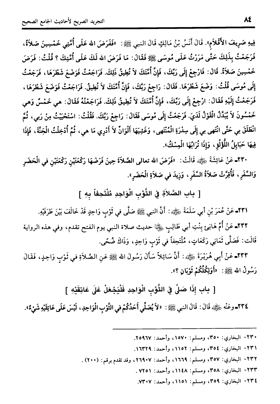 231 - عَنْ عُمَرَ بْنِ أَبِي سَلَمَةَ - رضي الله عنه -: أَنَّ النَّبِيَّ - صلى الله عليه وسلم - صَلَّى فِي ثَوْبٍ وَاحِدٍ قَدْ خَالَفَ بَيْنَ طَرَفَيْهِ. (بخاري: 354)