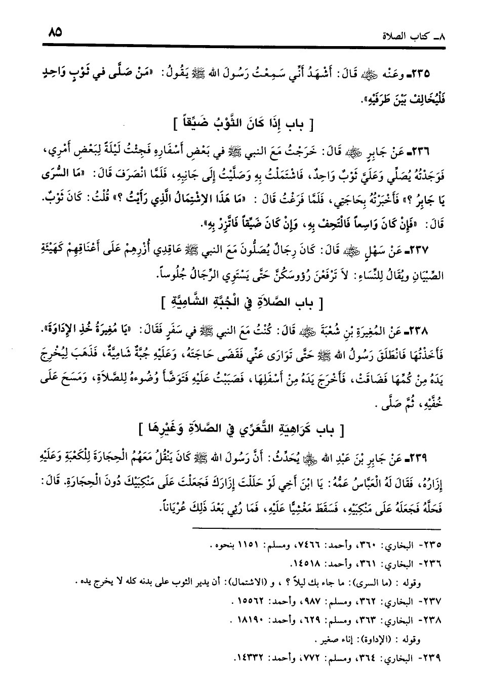 236 - عَنْ جَابِرِ بْنِ عَبْدِ اللَّهِ - رضي الله عنهما - قَالَ: خَرَجْتُ مَعَ النَّبِيِّ - صلى الله عليه وسلم - فِي بَعْضِ أَسْفَارِهِ، فَجِئْتُ لَيْلَةً لِبَعْضِ أَمْرِي، فَوَجَدْتُهُ يُصَلِّي وَعَلَيَّ ثَوْبٌ وَاحِدٌ، فَاشْتَمَلْتُ بِهِ وَصَلَّيْتُ إِلَى جَانِبِهِ، فَلَمَّا انْصَرَفَ قَالَ: «مَا السُّرَى يَا جَابِرُ»؟ فَأَخْبَرْتُهُ بِحَاجَتِي، فَلَمَّا فَرَغْتُ قَالَ: «مَا هَذَا الاشْتِمَالُ الَّذِي رَأَيْتُ»؟ قُلْتُ: كَانَ ثَوْبٌ، قَالَ: «فَإِنْ كَانَ وَاسِعًا فَالْتَحِفْ بِهِ، وَإِنْ كَانَ ضَيِّقًا فَاتَّزِرْ بِه». (بخاري: 361)