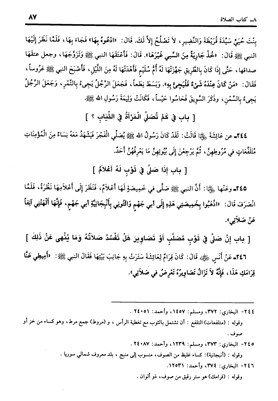 245 - عَنْ عَائِشَةَ - رضي الله عنها -: أَنَّ النَّبِيَّ - صلى الله عليه وسلم - صَلَّى فِي خَمِيصَةٍ لَهَا أَعْلامٌ فَنَظَرَ إِلَى أَعْلامِهَا نَظْرَةً فَلَمَّا انْصَرَفَ قَالَ: «اذْهَبُوا بِخَمِيصَتِي هَذِهِ إِلَى أَبِي جَهْمٍ وَأْتُونِي بِأَنْبِجَانِيَّةِ أَبِي جَهْمٍ فَإِنَّهَا أَلْهَتْنِي آنِفًا عَنْ صَلاتِي». (بخاري: 373)