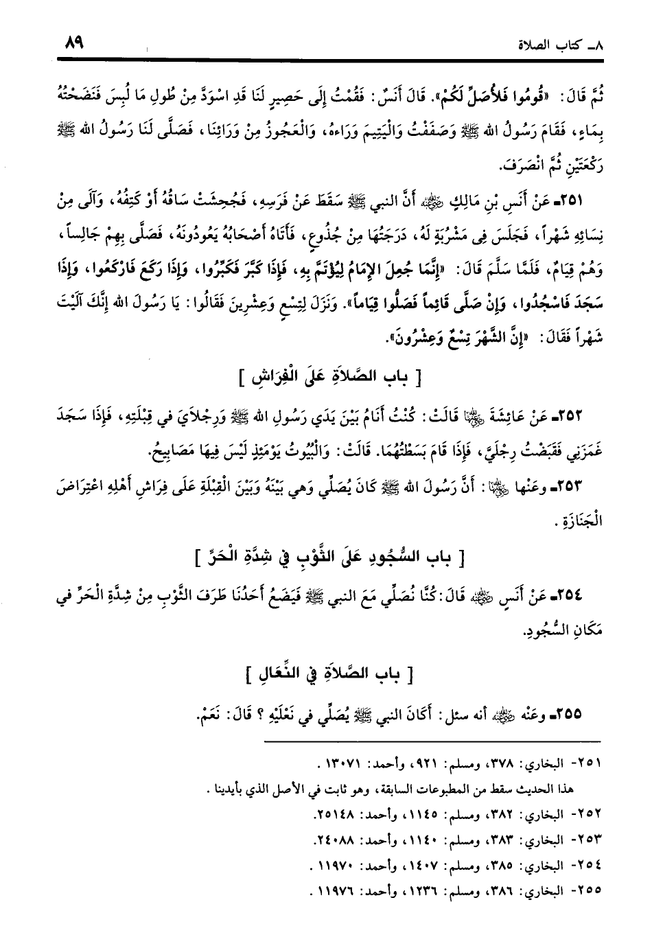 255 - وَعَنْهُ - رضي الله عنه - أنَّه سُئل: أَكَانَ النَّبِيُّ - صلى الله عليه وسلم - يُصَلِّي فِي نَعْلَيْهِ؟ قَالَ: نَعَمْ. (بخاري: 386)