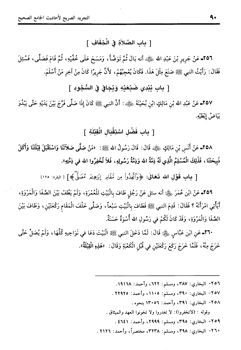 259 - عَنِ ابْنِ عُمَرَ - رضي الله عنهما -: أَنَّه سُئِلَ عَنْ رَجُلٍ طَافَ بِالْبَيْتِ للْعُمْرَةِ وَلَمْ يَطُفْ بَيْنَ الصَّفَا وَالْمَرْوَةِ، أَيَأْتِي امْرَأَتَهُ؟ فَقَالَ: قَدِمَ النَّبِيُّ - صلى الله عليه وسلم - فَطَافَ بِالْبَيْتِ سَبْعًا وَصَلَّى خَلْفَ الْمَقَامِ رَكْعَتَيْنِ وَطَافَ بَيْنَ الصَّفَا وَالْمَرْوَةِ، وَقَدْ كَانَ لَكُمْ فِي رَسُولِ الله أُسْوَةٌ حَسَنَةٌ. (بخاري: 395)