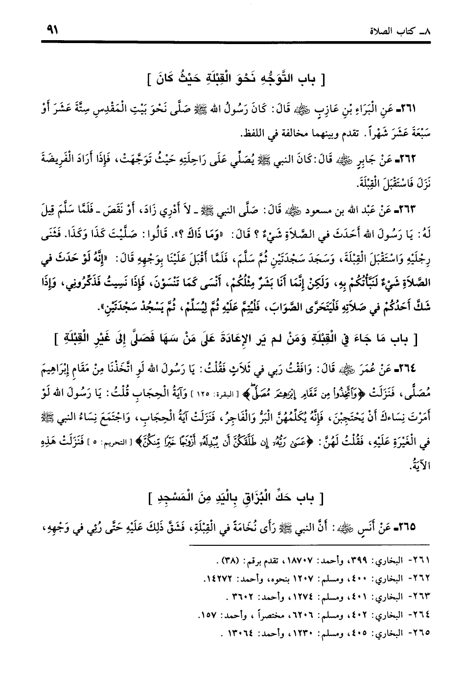 261 - عَنِ الْبَرَاءِ بْنِ عَازِبٍ - رضي الله عنهما - قَالَ: كَانَ رَسُولُ الله - صلى الله عليه وسلم - صَلَّى نَحْوَ بَيْتِ الْمَقْدِسِ سِتَّةَ عَشَرَ أَوْ سَبْعَةَ عَشَرَ شَهْرًا. تَقَدَّمَ وَبَيْنَهُمَا اِخْتِلافٌ فِي اللَّفْظِ. (بخاري: 399)
