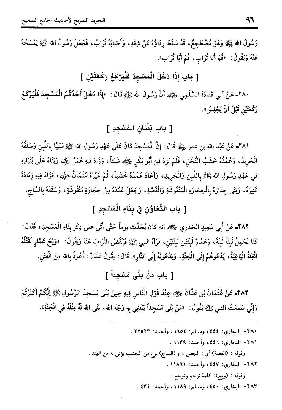 283 - عن عُثْمَانَ بْنِ عَفَّانَ - رضي الله عنه - عِنْدَ قَوْلِ النَّاسِ فِيهِ حِينَ بَنَى مَسْجِدَ الرَّسُولِ - صلى الله عليه وسلم - قَالَ: إِنَّكُمْ أَكْثَرْتُمْ، وَإِنِّي سَمِعْتُ النَّبِيَّ - صلى الله عليه وسلم - يَقُولُ: «مَنْ بَنَى مَسْجِدًا يَبْتَغِي بِهِ وَجْهَ اللَّهِ بَنَى اللَّهُ لَهُ مِثْلَهُ فِي الْجَنَّةِ». (بخاري: 450)
