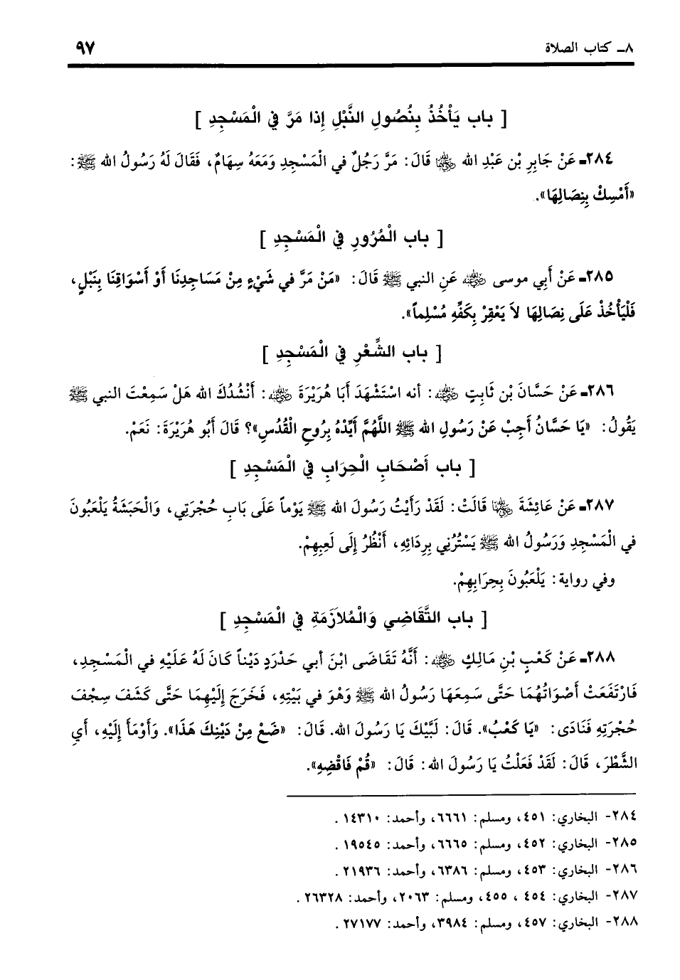 284 - عن جَابِرِ بْنِ عَبْدِ اللَّهِ - رضي الله عنهما - يَقُوْلُ: مَرَّ رَجُلٌ فِي الْمَسْجِدِ وَمَعَهُ سِهَامٌ فَقَالَ لَهُ رَسُولُ اللَّهِ - صلى الله عليه وسلم -: «أَمْسِكْ بِنِصَالِهَا» (بخاري: 451)