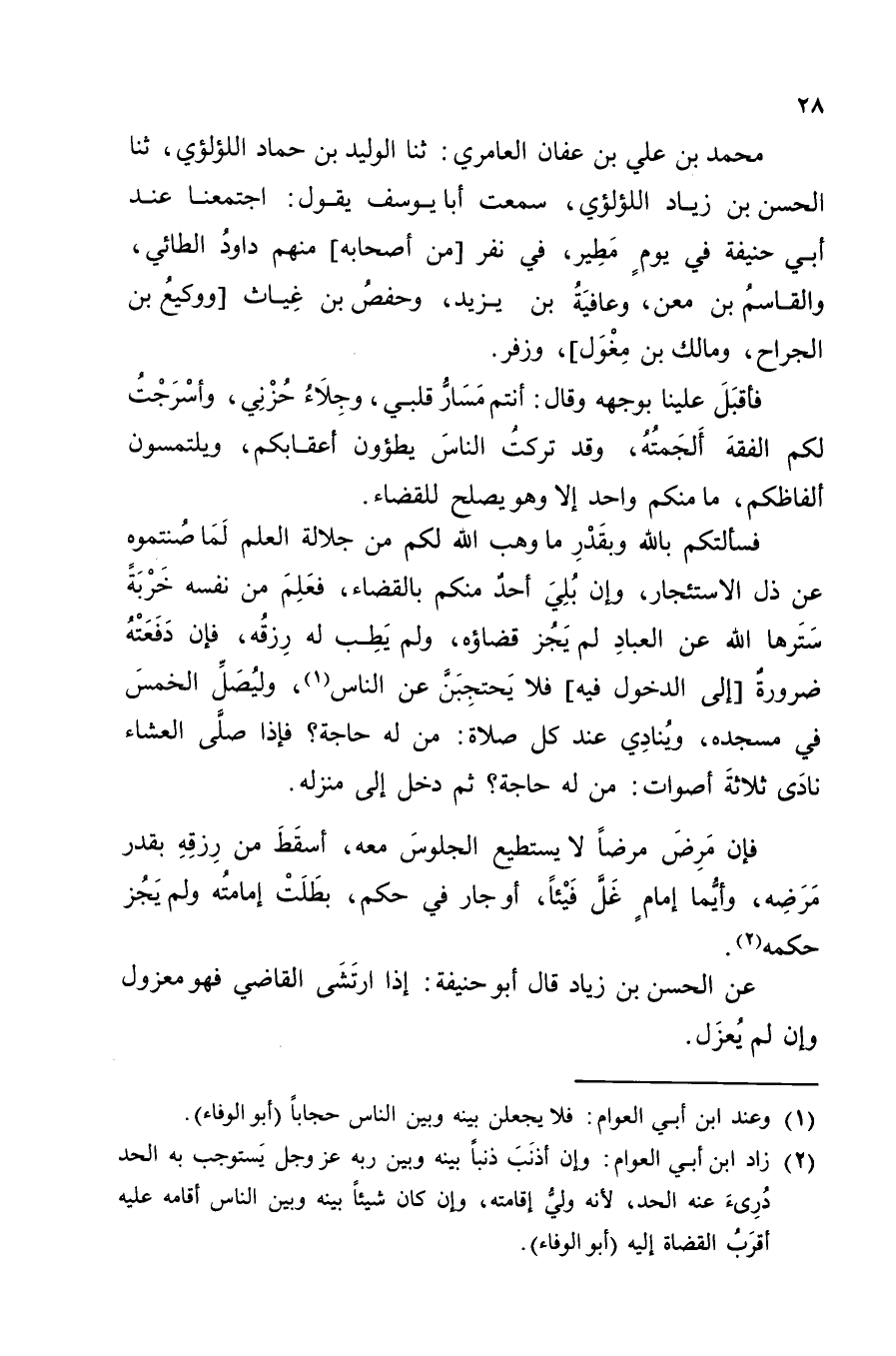 مُحَمَّدُ بْنُ عَلِيِّ بْنِ عَفَّانَ الْعَامِرِيُّ، ثَنَا الْوَلِيدُ بْنُ حَمَّادٍ اللُّؤْلُئِيُّ، ثَنَا الْحَسَنُ بْنُ زِيَادٍ اللُّؤْلُئِيُّ، سَمِعْتُ أَبَا يُوسُفَ، يَقُولُ: اجْتَمَعْنَا عِنْدَ أَبِي حَنِيفَةَ فِي يَوْمٍ مَطِيرٍ فِي نَفَرٍ مِنْ أَصْحَابِهِ مِنْهُمْ: دَاوُدُ الطَّائِيُّ، وَالْقَاسِمُ بْنُ مَعْنٍ، وَعَافِيَةُ بْنُ يَزِيدَ، وَحَفْصُ بْنُ غِيَاثٍ، وَوَكِيعُ بْنُ الْجَرَّاحِ، وَمَالِكُ بْنُ مِغْوَلٍ، وَزُفَرُ، فَأَقْبَلَ عَلَيْنَا بِوَجْهِهِ، وَقَالَ: " أَنْتَمْ مَسَارُّ قَلْبِي، وَجِلاءُ حُزْنِي، وَأَسْرَجْتُ لَكُمُ الْفِقْهَ وَأَلْجَمْتُهُ، وَقَدْ تَرَكْتُ النَّاسَ يَطَئُونَ أَعْقَابَكُمْ، وَيَلْتَمِسُونَ أَلْفَاظَكُمْ مَا مِنْكُمْ وَاحِدٌ إِلا وَهُوَ يَصْلُحُ لِلْقَضَاءِ، فَسَأَلْتُكُمْ بِاللَّهِ وَبِقَدْرِ مَا وَهَبَ اللَّهُ لَكُمْ مُنْ جَلالَةِ الْعِلْمِ مَا صُنْتُمُوهُ عَنْ ذَلِكَ الاسْتِئْجَارِ، وَإِنْ بُلِيَ أَحَدٌ مِنْكُمْ بِالْقَضَاءِ، فَعَلِمَ مِنْ نَفْسِهِ خَرِبَةً سَتَرَهَا اللَّهُ عَنِ الْعِبَادِ لَمْ يَجُزْ قَضَاؤُهُ، وَلَمْ يَطِبْ لَهُ رِزْقُهُ، فَإِنْ دَفَعَتْهُ ضَرُورَةٌ إِلَى الدُّخُولِ فِيهِ، فَلا يَحْتَجِبَنَّ عَنِ النَّاسِ، وَلْيُصَلِّ الْخَمْسَ فِي مَسْجِدِهِ، وَيُنَادِي عِنْدَ كُلِّ صَلاةٍ: مَنْ لَهُ حَاجَةٌ؟ فَإِذَا صَلَّى الْعِشَاءَ نَادَى ثَلاثَةَ أَصْوَاتٍ: مَنْ لَهُ حَاجَةٌ؟ ثُمَّ دَخَلَ إِلَى مَنْزِلِهِ، فَإِنْ مَرِضَ مَرَضًا لا يَسْتَطِيعُ الْجُلُوسَ مَعَهُ أَسْقَطَ مِنْ رِزْقِهِ بِقَدْرِ مَرَضِهِ، وَأَيَّمَا إِمَامٍ غَلَّ فَيْئًا أَوْ جَارَ فِي حُكْمٍ، بَطُلَتْ إِمَامَتُهُ وَلَمْ يَجُزْ حُكْمُهُ "
