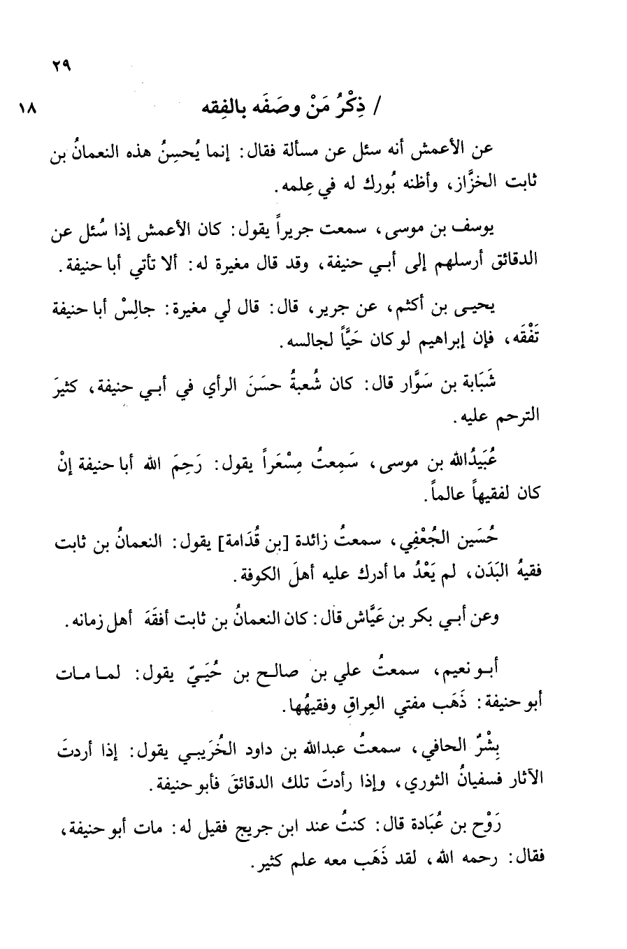 حُسَيْنٌ الْجُعْفِيُّ، سَمِعْتُ زَائِدَةَ بْنَ قُدَامَةَ، يَقُولُ: «النُّعْمَانُ بْنُ ثَابِتٍ فَقِيهُ الْبَدَنِ لَمْ يَعُدْ مَا أَدْرَكَ عَلَيْهِ أَهْلُ الْكُوفَةِ» .