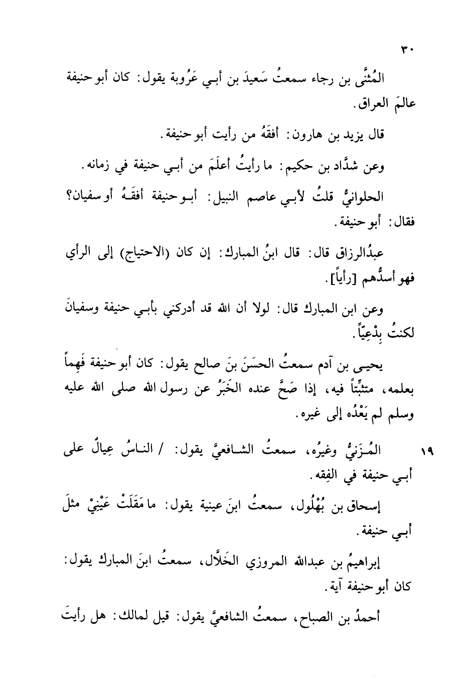 الْمُثَنَّى بْنُ رَجَاءٍ، سَمِعْتُ سَعِيدَ بْنَ أَبِي عَرُوبَةَ، يَقُولُ: «كَانَ أَبُو حَنِيفَةَ عَالِمَ الْعِرَاقِ» ، قَالَ زَيْدُ بْنُ هَارُونَ: أَفْقَهُ مَنْ رَأَيْتُ أَبُو حَنِيفَةَ، وَعَنْ شَدَّادِ بْنِ حَكِيمٍ: " مَا رَأَيْتُ أَعْلَمَ مِنْ أَبِي حَنِيفَةَ فِي زَمَانِهِ.
