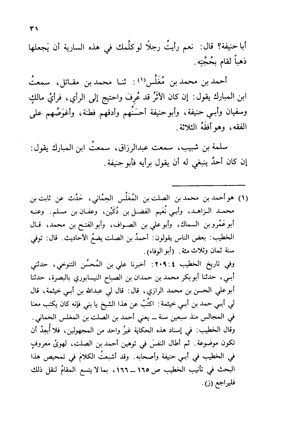 أَحْمَدُ بْنُ مُحَمَّدِ بْنِ مُغَلِّسٍ: ثَنَا مُحَمَّدُ بْنُ مُقَاتِلٍ، سَمِعْتُ ابْنَ الْمُبَارَكِ، يَقُولُ: «إِنْ كَانَ الأَثَرُ قَدْ عُرِفَ وَاحْتِيجَ إِلَى الرَّأْيِ، فَرَأْيُ مَالِكٍ وَسُفْيَانَ، وَأَبِي حَنِيفَةَ، وَأَبُو حَنِيفَةَ أَحْسَنُهُمْ وَأَدَقُّهُمْ فِطْنَةً وَأَغْوَصُهُمْ عَلَى الْفِقْهِ وَهُوَ أَفْقَهُ الثَّلاثَةِ»