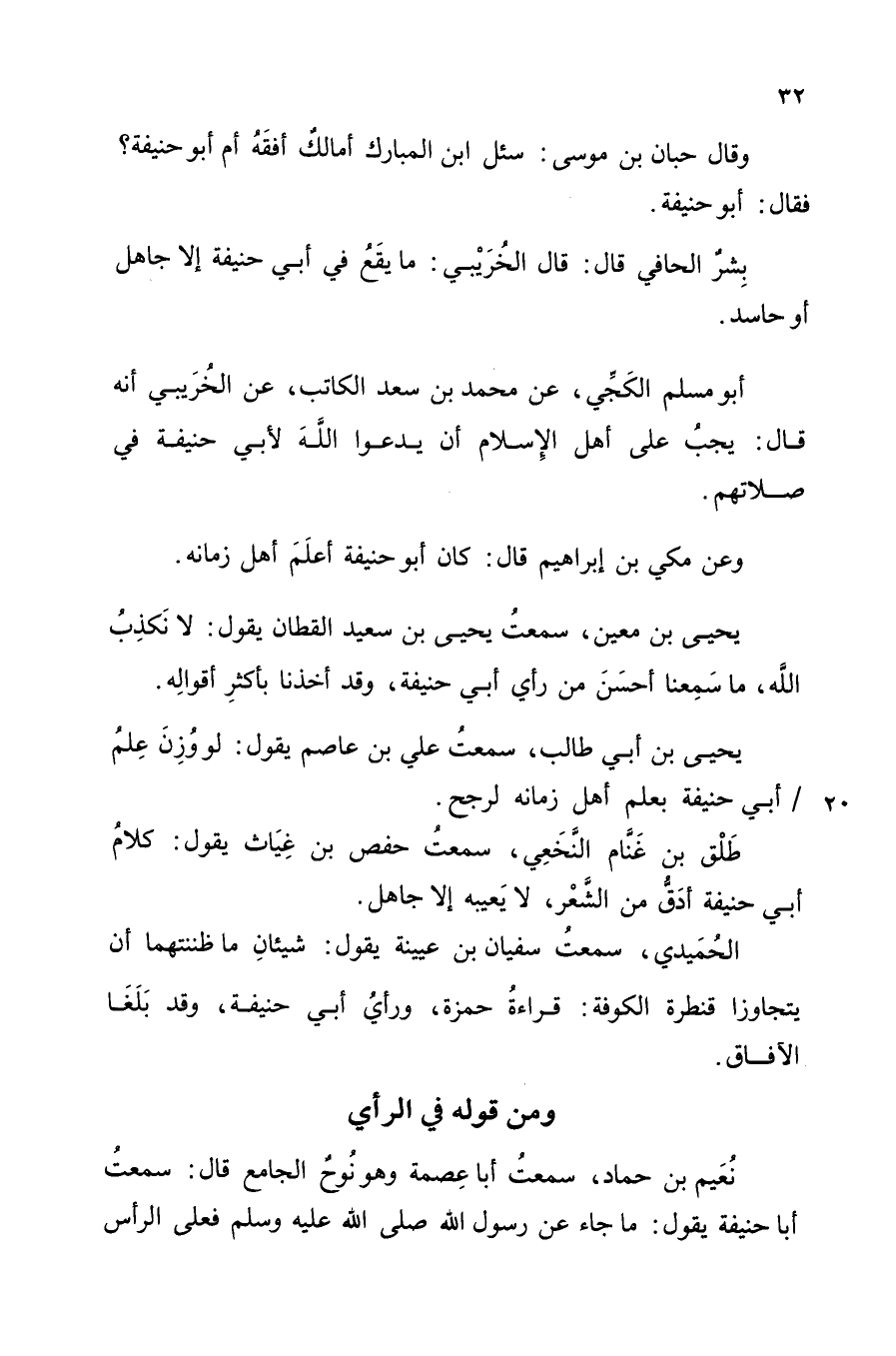 وَعَنْ مَكِّيِّ بْنِ إِبْرَاهِيمَ، قَالَ: «كَانَ أَبُو حَنِيفَةَ أَعْلَمَ أَهْلِ زَمَانِهِ»