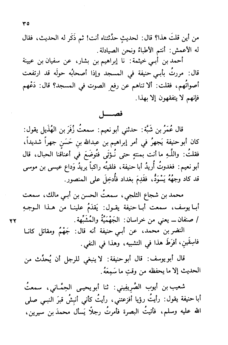 النَّضْرُ بْنُ مُحَمَّدٍ، عَنْ أَبِي حَنِيفَةَ، أَنَّهُ قَالَ: «جَهْمٌ وَمُقَاتِلٌ كَانَا فَاسِقَيْنِ، أَفْرَطَ هَذَا فِي التَّشْبِيهِ وَهَذَا فِي النَّفْيِ»