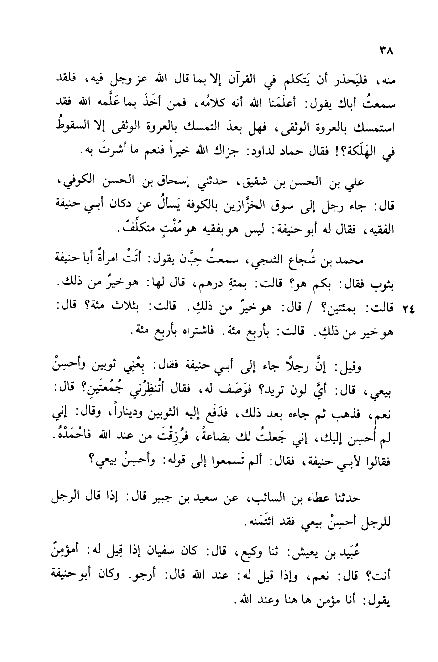 مُحَمَّدُ بْنُ شُجَاعٍ الثَّلْجِيُّ، سَمِعْتُ حِبَّانَ، يَقُولُ: " أَتَتِ امْرَأَةٌ أَبَا حَنِيفَةَ بِثَوْبٍ، فَقَالَ: بِكَمْ هُوَ؟ قَالَتْ: بِمِائَةِ دِرْهَمٍ، قَالَ لَهَا: هُوَ خَيْرٌ مِنْ ذَلِكَ، قَالَتْ: بِمَائَتَيْنِ، قَالَ: هُوَ خَيْرٌ مِنْ ذَلِكَ، قَالَتْ: بِثَلاثِ مِائَةٍ، قَالَ: هُوَ خَيْرٌ مِنْ ذَلِكَ، قَالَتْ: بِأَرْبَعِ مِائَةٍ فَاشْتَرَاهُ بِأَرْبَعِ مِائَةٍ، وَقِيلَ: إِنَّ رَجُلًا جَاءَ إِلَى أَبِي حَنِيفَةَ، فَقَالَ: بِعْنِي ثَوْبَيْنِ وَأَحْسِنْ بَيْعِي، قَالَ: أَيَّ لَوْنٍ تُرِيدُ؟ فَوَصَفَ لَهُ، فَقَالَ: أَتُنْظِرُنِي جُمْعَتَيْنِ؟ قَالَ: نَعَمْ، فَذَهَبَ، ثُمَّ جَاءَهُ بَعْدَ ذَلِكَ فَدَفَعَ إِلَيْهِ الثَّوْبَيْنِ وَدِينَارًا، وَقَالَ: إِنِّي لَمْ أُحْسِنْ إِلَيْكَ إِنِّي جَعَلْتُ لَكَ بِضَاعَةً، فَرُزِقْتَ مِنْ عِنْدِ اللَّهِ فَاحْمَدْهُ، فَقَالُوا لأَبِي حَنِيفَةَ، فَقَالَ: أَلَمْ تَسْمَعُوا إِلَى قَوْلِهِ: وَأَحْسِنْ بَيْعِي؟ "، حَدَّثَنَا عَطَاءُ بْنُ السَّائِبِ، عَنْ سَعِيدِ بْنِ جُبَيْرٍ، قَالَ: إِذَا قَالَ الرَّجُلُ لِلرَّجُلِ أَحْسِنْ بَيْعِي فَقَدِ ائْتَمَنَهُ "