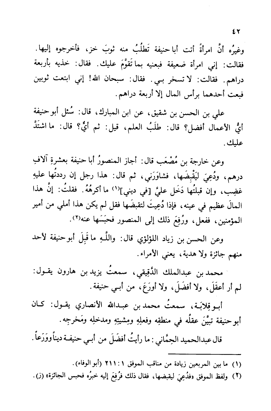 وَعَنْ خَارِجَةَ بْنِ مُصْعَبٍ، قَالَ: " أَجَازَ الْمَنْصُورُ أَبَا حَنِيفَةَ بِعَشْرَةِ آلافِ دِرْهَمٍ، وَدُعِيَ لِيَقْبِضَهَا فَشَاوَرَنِي، ثُمَّ قَالَ: هَذَا رَجُلٌ إِنْ رَدَدْتُهَا عَلَيْهِ غَضِبَ، وَإِنْ قَبِلْتُهَا دَخَلَ عَلَيَّ فِي دِينِي مَا أَكْرَهُهُ، فَقُلْتُ: إِنَّ هَذَا الْمَالَ عَظِيمٌ فِي عَيْنِهِ، أَفَإِذَا دُعِيتَ لِتَقْبِضَهَا، فَقُلْ: لَمْ يَكُنْ هَذَا أَمَلِي مِنْ أَمِيرِ الْمُؤْمِنِينَ، فَفَعَلَ وَرَفَعَ ذَلِكَ إِلَى الْمَنْصُورِ فَحَبَسَهَا عَنْهُ "