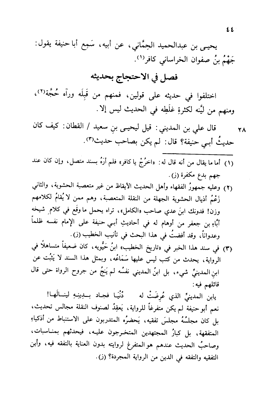 يَحْيَى بْنُ عَبْدِ الْحَمِيدِ الْحِمَّانِيُّ، عَنْ أَبِيهِ، سَمِعَ أَبَا حَنِيفَةَ، يَقُولُ: «جَهْمُ بْنُ صَفْوَانَ الْخُرَاسَانِيُّ كَافِرٌ»