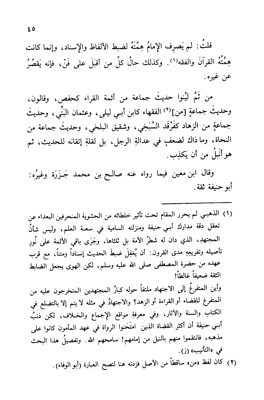 قُلْتُ: لَمْ يَصْرِفِ الإِمَامُ هِمَّتَهُ لِضَبْطِ الأَلْفَاظِ وَالإِسْنَادِ، وَإِنَّمَا كَانَتْ هِمَّتُهُ الْقُرْآنُ وَالْفِقْهُ، وَكَذَلِكَ حَالُ كُلِّ مَنْ أَقْبَلَ عَلَى فَنٍّ، فَإِنَّهُ يُقَصِّرُ عَنْ غَيْرِهِ , مِنْ ثَمَّ لَيَّنُوا حَدِيثَ جَمَاعَةٍ مِنْ أَئِمَّةِ الْقُرَّاءِ كَحَفْصٍ، وَقَالُونَ وَحَدِيثَ جَمَاعَةٍ مِنَ الْفُقَهَاءِ كَابْنِ أَبِي لَيْلَى، وَعُثْمَانَ الْبَتَّيِّ، وَحَدِيثَ جَمَاعَةٍ مِنَ الزُّهَّادِ كَفَرْقَدٍ السِّنْجِيِّ، وَشَقِيقٍ الْبَلْخِيِّ، وَحَدِيثَ جَمَاعَةٍ مِنَ النُّحَاةِ، وَمَا ذَاكَ لِضَعْفٍ فِي عَدَالَةِ الرَّجُلِ، بَلْ لِقِلَّةِ إِتَّقَانِهِ لِلْحَدِيثِ، ثُمَّ هُوَ أَنْبَلُ مِنْ أَنْ يَكْذِبَ "، وَقَالَ ابْنُ مَعِينٍ فِيمَا رَوَاهُ عَنْهُ صَالِحُ بْنُ مُحَمَّدٍ جَزَرَةٌ وَغَيْرُهُ: أَبُو حَنِيفَةَ ثِقَةٌ،