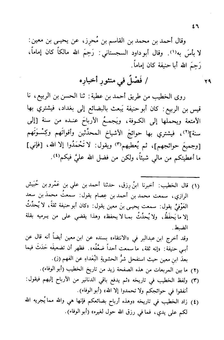 رَوَى الْخَطِيبُ مِنْ طَرِيقِ أَحْمَدَ بْنِ عَطِيَّةَ، ثَنَا الْحَسَنُ بْنُ الرَّبِيعِ، نا قَيْسُ بْنُ الرَّبِيعِ: كَانَ أَبُو حَنِيفَةَ يَبْعَثُ بِالْبَضَائِعِ إِلَى بَغْدَادَ، فَيَشْتَرِي بِهَا الأَمْتِعَةَ وَيَحْمِلُهَا إِلَى الْكُوفَةِ، وَيَجْمَعُ الأَرْبَاحَ عِنْدَهُ مِنْ سَنَةٍ إِلَى سَنَةٍ، فَيَشْتَرِي بِهَا حَوَائِجَ الأَشْيَاخِ الْمُحَدِّثِينَ، وَأَقْوَاتَهُمْ، وَكُسْوَتَهُمْ، وَجَمِيعَ حَوَائِجِهِمْ، ثُمَّ يُعْطِيهِمْ، وَيَقُولُ: «لا تَحْمَدُوا إِلا اللَّهَ، فَإِنِّي مَا أَعْطَيْتُكُمْ مِنْ مَالِي شَيْئًا، وَلَكِنْ مِنْ فَضْلِ اللَّهِ عَلَيَّ فِيكُمْ»