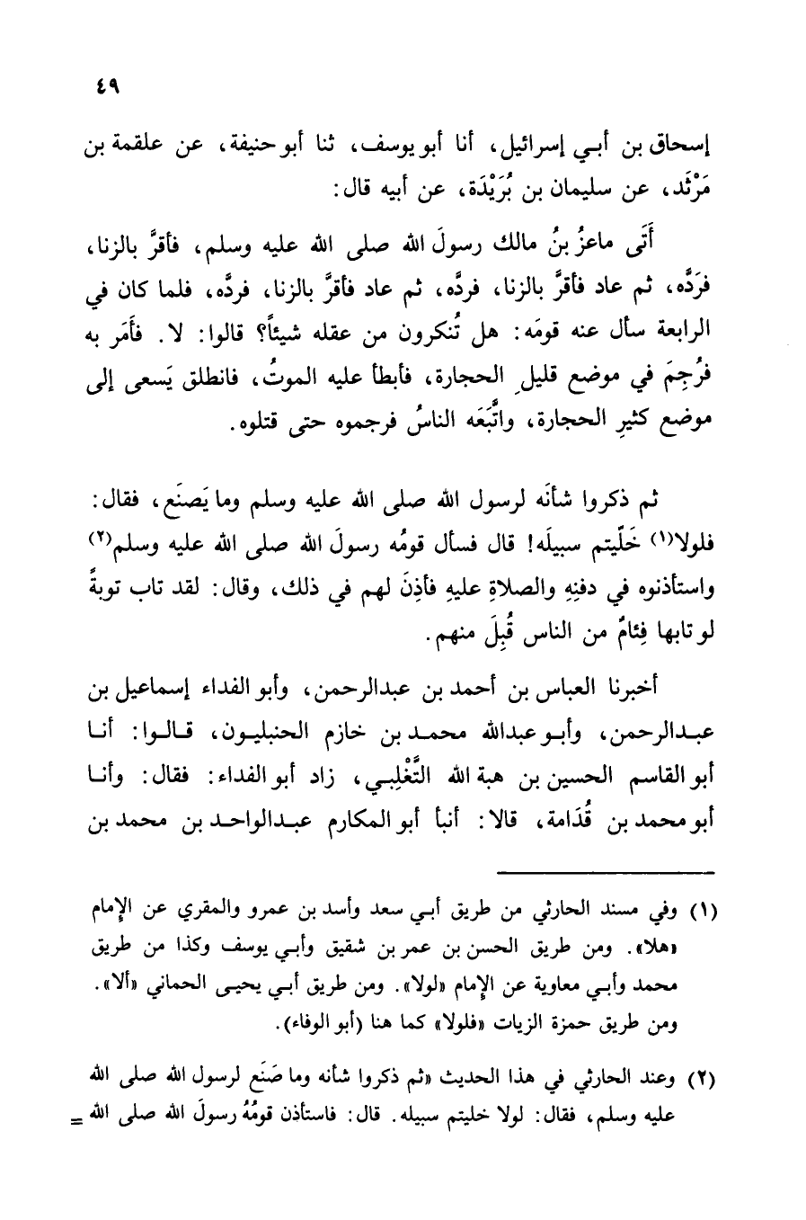 إِسْحَاقُ بْنُ أَبِي إِسْرَائِيلَ، أَنَا أَبُو يُوسُفَ، ثَنَا أَبُو حَنِيفَةَ، عَنْ عَلْقَمَةَ بْنِ مَرْثَدٍ، عَنْ سُلَيْمَانَ بْنِ بُرَيْدَةَ، عَنْ أَبِيهِ، قَالَ: أَتَى مَاعِزُ بْنُ مَالِكٍ رَسُولَ اللَّهِ صَلَّى اللَّهُ عَلَيْهِ وَسَلَّمَ، فَأَقَرَّ بِالزِّنَا فَرَدَّهُ، ثُمَّ عَادَ فَأَقَرَّ بِالزِّنَا فَرَدَّهُ، ثُمَّ عَادَ فَأَقَرَّ بِالزِّنَا فَرَدَّهُ، فَلَمَّا كَانَ فِي الرَّابِعَةِ سَأَلَ عَنْهُ قَوْمَهُ: «هَلْ تُنْكِرُونَ مِنْ عَقْلِهِ شَيْئًا؟» قَالُوا: لا، فَأَمَرَ بِهِ فَرُجِمَ فِي مَوْضِعٍ قَلِيلِ الْحِجَارَةِ، فَأَبْطَأَ عَلَيْهِ الْمَوْتُ، فَانْطَلَقَ يَسْعَى إِلَى مَوْضِعٍ كَثِيرِ الْحِجَارَةِ وَاتَّبَعَهُ النَّاسُ، فَرَجَمُوهُ حَتَّى قَتَلُوهُ، ثُمَّ ذَكَرُوا شَأْنَهُ لِرَسُولِ اللَّهِ صَلَّى اللَّهُ عَلَيْهِ وَسَلَّمَ وَمَا يَصْنَعُ، فَقَالَ: «فَلَوْلا خَلَّيْتُمْ سَبِيلَهُ!» قَالَ: فَسَأَلَ قَوْمُهُ رَسُولَ اللَّهِ صَلَّى اللَّهُ عَلَيْهِ وَسَلَّمَ وَاسْتَأْذَنُوهُ فِي دَفْنِهِ وَالصَّلاةِ عَلَيْهِ، فَأَذِنَ لَهُمْ فِي ذَلِكَ، وَقَالَ: «لَقَدْ تَابَ تَوْبَةً لَوْ تَابَهَا فِئَامٌ مِنَ النَّاسِ قُبِلَ مِنْهُمْ»