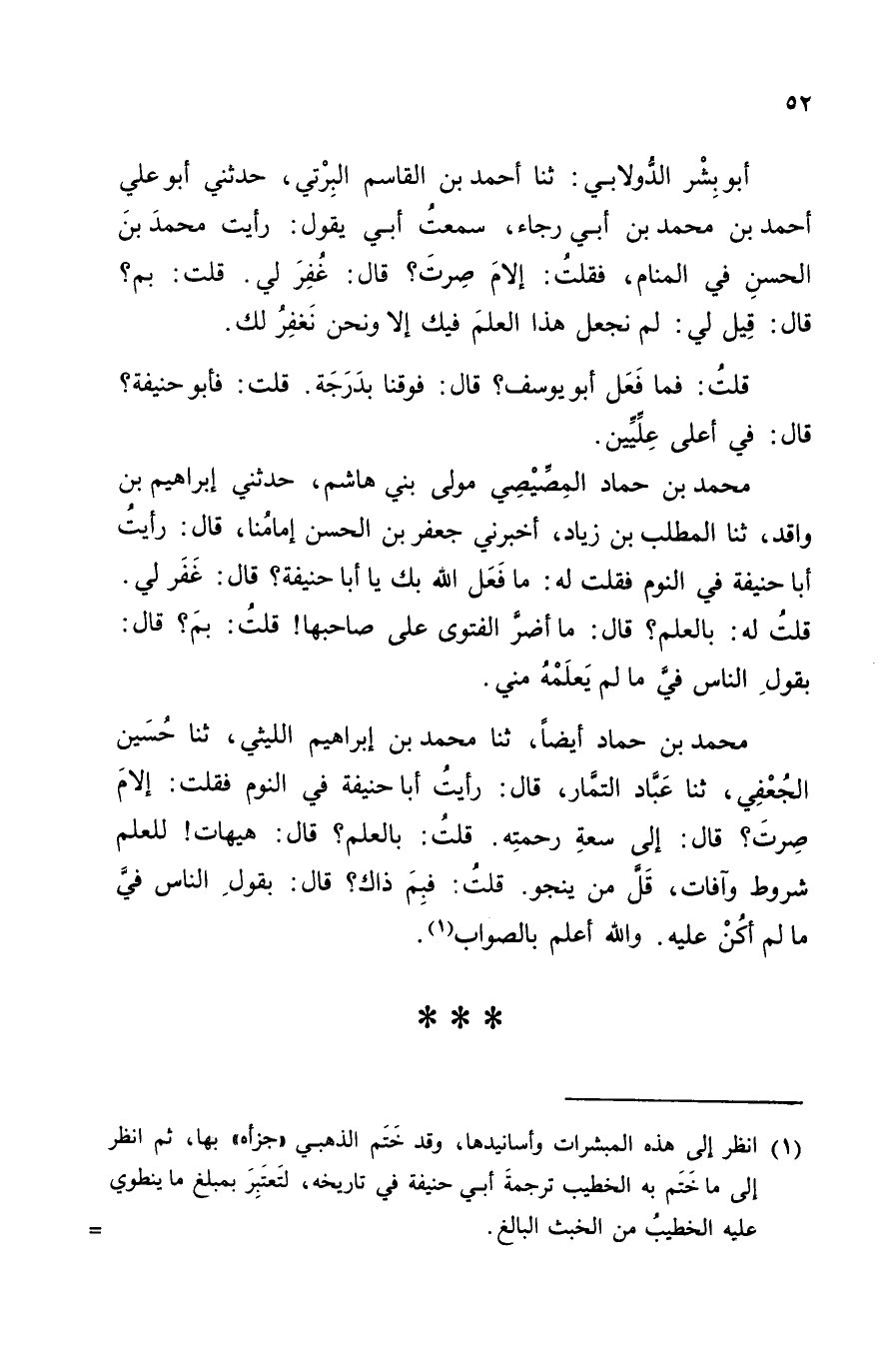 مُحَمَّدُ بْنُ حَمَّادٍ الْمُصَيْصِيُّ مَوْلَى بَنِي هَاشِمٍ، حَدَّثَنِي إِبْرَاهِيمُ بْنُ وَاقِدٍ، ثَنَا الْمُطَّلِبُ بْنُ زِيَادٍ، أَخْبَرَنِي جَعْفَرُ بْنُ الْحَسَنِ إِمَامُنَا، قَالَ: " رَأَيْتُ أَبَا حَنِيفَةَ فِي النَّوْمِ، فَقُلْتُ لَهُ: مَا فَعَلَ اللَّهُ بِكَ يَا أَبَا حَنِيفَةَ؟ قَالَ: غَفَرَ لِي، قُلْتُ لَهُ: بِالْعِلْمِ؟ قَالَ: مَا أَضَرَّ الْفَتْوَى عَلَى صَاحِبِهَا! قُلْتُ: بِمَ؟ قَالَ: بِقَوْلِ النَّاسِ فِيَّ مَا لَمْ يَعْلَمْهُ مِنِّي "