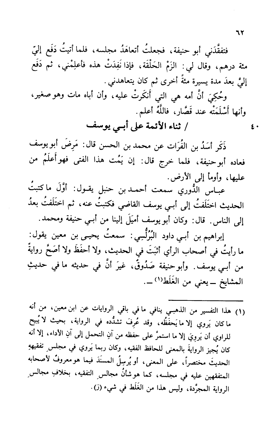 فَتَفَقَّدَنِي أَبُو حَنِيفَةَ، فَجَعَلْتُ أَتَعَاهَدُ مَجْلِسَهُ، فَلَمَّا أَتَيْتُ دَفَعَ إِلَيَّ مِائَةَ دِرْهَمٍ، وَقَالَ لِي: الْزَمِ الْحَلَقَةَ، فَإِذَا نَفَدَتْ هَذِهِ فَأَعْلِمْنِي، ثُمَّ دَفَعَ إِلَيَّ بَعْدَ مُدَّةٍ يَسِيرَةٍ مِائَةَ أُخْرَى، ثُمَّ كَانَ يَتَعَاهَدُنِي، وَحَكَى أَنَّ أُمَّهُ هِيَ الَّتِي أَنْكَرَتْ عَلَيْهِ، وَأَنَّ أَبَاهُ مَاتَ وَهُوَ صَغِيرٌ، وَأَنَّهَا أَسْلَمَتْهُ عِنْدَ قَصَّارٍ، فَاللَّهُ أَعْلَمُ "