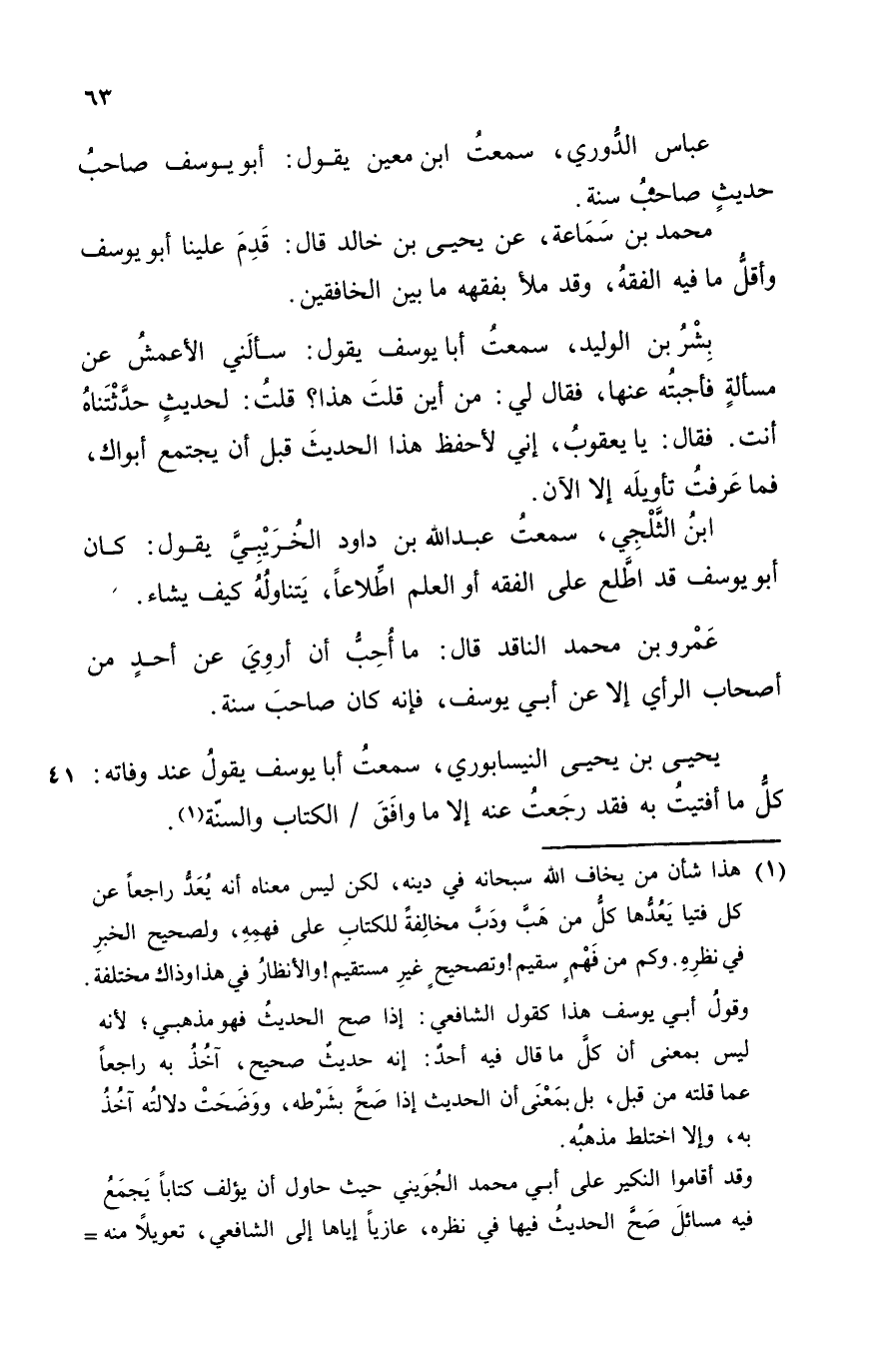 عَبَّاسٌ الدُّورِيُّ، سَمِعْتُ ابْنَ مَعِينٍ، يَقُولُ: «أَبُو يُوسُفَ صَاحِبُ حَدِيثٍ، صَاحِبُ سُنَّةٍ»