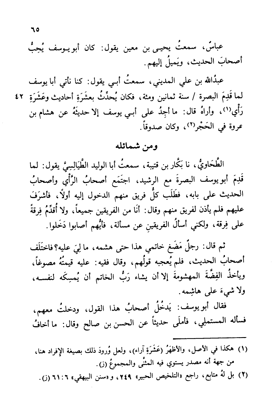 عَبَّاسٌ، سَمِعْتُ يَحْيَى بْنَ مَعِينٍ، يَقُولُ: «كَانَ أَبُو يُوسُفَ يُحِبُّ أَصْحَابَ الْحَدِيثِ وَيَمِيلِ إِلَيْهِمْ»