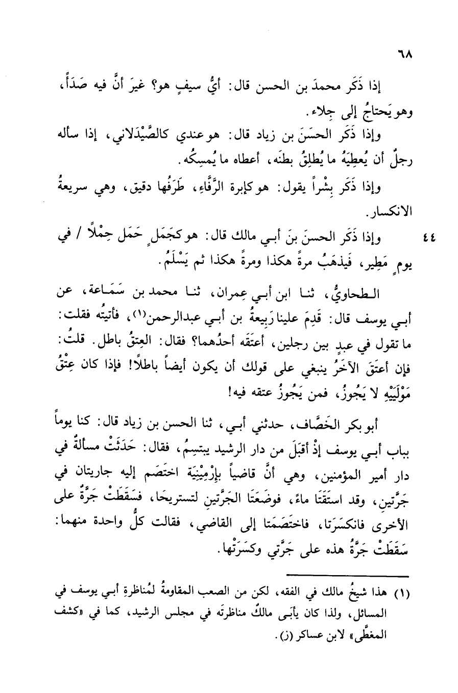 أَبُو بَكْرٍ الْخَصَّافُ، حَدَّثَنِي أَبِي، ثَنَا الْحَسَنُ بْنُ زِيَادِ، قَالَ: " كُنَّا يَوْمًا بِبَابِ أَبِي يُوسُفَ إِذْ أَقْبَلَ مِنْ دَارِ الرَّشِيدِ يَبْتَسِمُ، فَقَالَ: حَدَثَتْ مَسْأَلَةٌ فِي دَارِ أَمِيرِ الْمُؤْمِنِينَ، وَهِيَ أَنَّ قَاضِيًا بِأَرْمِنِيَّةَ اخْتَصَمَ إِلَيْهِ جَارِيَتَانِ فِي جَرَّتَيْنِ، وَقَدِ اسْتَقَتَا مَاءً فَوَضَعَتَا الْجَرَّتَيْنِ لِتَسْتَرِيحَا، فَسَقَطَتْ جَرَّةٌ عَلَى الأُخْرَى فَانْكَسَرَتَا، فَاخْتَصَمَتَا إِلَى الْقَاضِي، فَقَالَتْ كُلُّ وَاحِدَةٍ مِنْهُمَا: سَقَطَتْ جَرَّةُ هَذِهِ عَلَى جَرَّتِي وَكَسَرَتْهَا،