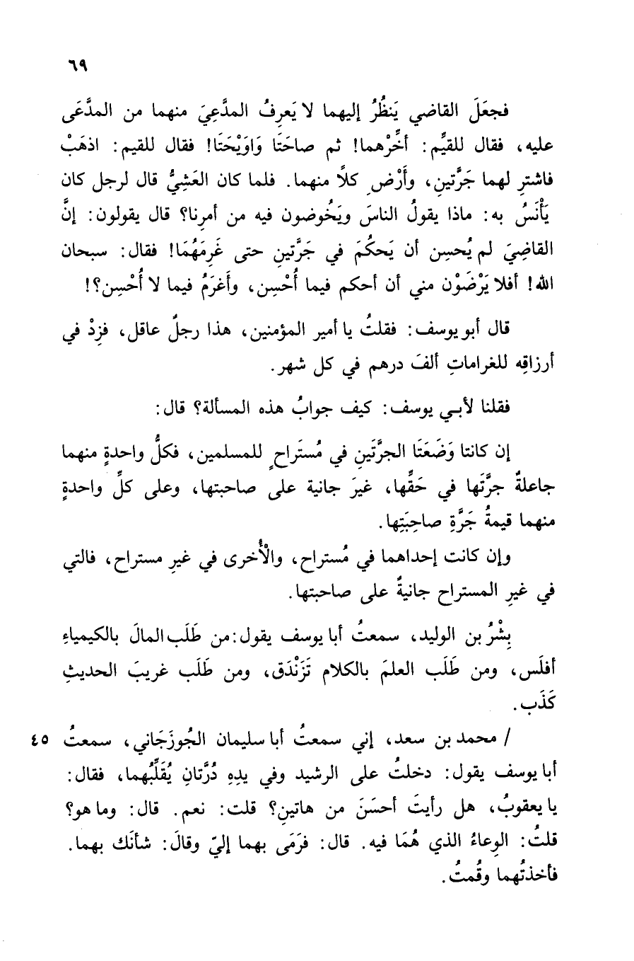 فَجَعَلَ الْقَاضِي يَنْظُرُ إِلَيْهِمَا لا يَعْرِفُ الْمُدَّعِي مِنْهُمَا مِنَ الْمُدَّعَى عَلَيْهِ، فَقَالَ لِلْقَيِّمِ: أَخِّرْهُمَا، ثُمَّ صَاحَتَا وَاوَيْحَتَا! فَقَالَ لِلْقَيِّمِ: اذْهَبْ فَاشْتَرِ لَهُمَا جَرَّتَيْنِ وَأَرْضِ كُلًا مِنْهُمَا، فَلَمَّا كَانَ الْعَشِيُّ، قَالَ لِرَجُلٍ كَانَ يَأْنَسُ بِهِ: مَاذَا يَقُولُ النَّاسُ وَيَخُوضُونَ فِيهِ مِنْ أَمْرِنَا؟ قَالَ يَقُولُونَ: إِنَّ الْقَاضِي لَمْ يُحْسِنْ أَنْ يَحْكُمَ فِي جَرَّتَيْنِ حَتَّى غَرِمَهُمَا، فَقَالَ: سُبْحَانَ اللَّهِ، أَفَلا يَرْضَوْنَ مِنِّي أَنْ أَحْكُمَ فِيمَا أُحْسِنُ، وَأَغْرَمَ فِيمَا لا أُحْسِنُ؟ ! قَالَ أَبُو يُوسُفَ: فَقُلْتُ: يَا أمير الْمُؤْمِنِينَ، هَذَا رَجُلٌ عَاقِلٌ فَزِدْ فِي أَرْزَاقِهِ لِلْغَرَامَاتِ أَلْفَ دِرْهَمٍ فِي كُلِّ شَهْرٍ، فَقُلْنَا لأَبِي يُوسُفَ: كَيْفَ جَوَابُ هَذِهِ الْمَسْأَلَةِ؟ قَالَ: إِنْ كَانَتَا وَضَعَتَا الْجَرَّتَيْنِ فِي مُسْتَرَاحٍ لِلْمُسْلِمِينَ، فَكُلُّ وَاحِدَةٍ مِنْهُمَا جَاعِلَةٌ جَرَّتَهَا فِي حَقِّهَا غَيْرَ جَانِيَةٍ عَلَى صَاحِبَتِهَا، وَعَلَى كُلِّ وَاحِدَةٍ مِنْهُمَا قِيمَةُ جَرَّةِ صَاحِبَتِهَا، وَإِنْ كَانَتْ إِحْدَاهُمَا فِي مُسْتَرَاحٍ وَالأُخْرَى فِي غَيْرِ مُسْتَرَاحٍ، فَالَّتِي فِي غَيْرِ الْمُسْتَرَاحِ جَانِيَةٌ عَلَى صَاحِبَتِهَا "