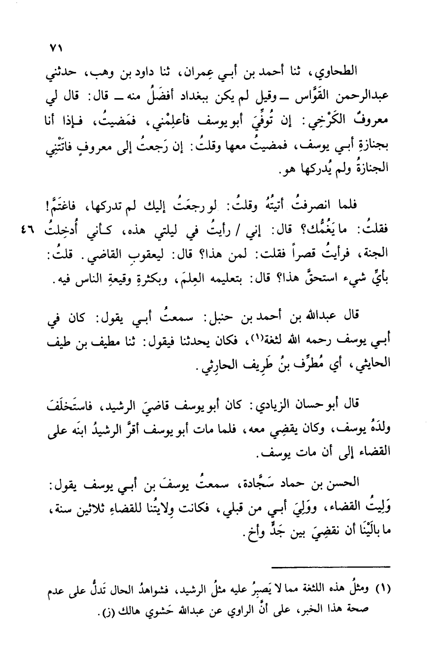 الطَّحَاوِيُّ ثَنَا أَحْمَدُ بْنُ أَبِي عِمْرَانَ، ثَنَا دَاوُدُ بْنُ وَهْبٍ، حَدَّثَنِي عَبْدُ الرَّحْمَنِ الْقَوَّاسُ، وَقِيلَ: لَمْ يَكُنْ بِبَغْدَادَ أَفْضَلَ مِنْهُ، قَالَ: قَالَ لِي مَعْرُوفٌ الْكَرْخَيُّ: إِنْ تُوِفُّيَ أَبُو يُوسُفَ، فَأَعْلِمْنِي، فَمَضَيْتُ فَإِذَا أَنَا بِجِنَازَةِ أَبِي يُوسُفَ، فَمَضَيْتُ مَعَهَا، وَقُلْتُ: إِنْ رَجِعْتُ إِلَى مَعْرُوفٍ فَاتَتْنِي الْجِنَازَةُ، وَلَمْ يُدْرِكْهَا هُوَ، فَلَمَّا انْصَرَفْتُ أَتَيْتُهُ، وَقُلْتُ: لَوْ رَجِعْتُ إِلَيْكَ لَمْ تُدْرِكْهَا، فَاغْتَمَّ! فَقُلْتُ: مَا يَغُمُّكَ؟ قَالَ: " إِنِّي رَأَيْتُ فِي لَيْلَتِي هَذِهِ كَأَنِّي أُدْخِلْتُ الْجَنَّةَ، فَرَأَيْتُ قَصْرًا، فَقُلْتُ: لِمَنْ هَذَا؟ قَالَ: لِيَعْقُوبَ الْقَاضِي، قُلْتُ: بِأَيِّ شَيْءٍ اسْتَحَقَّ هَذَا؟ قَالَ: بِتَعْلِيمِهِ الْعِلْمَ وَبِكَثْرَةِ وَقِيعَةِ النَّاسِ فِيهِ "