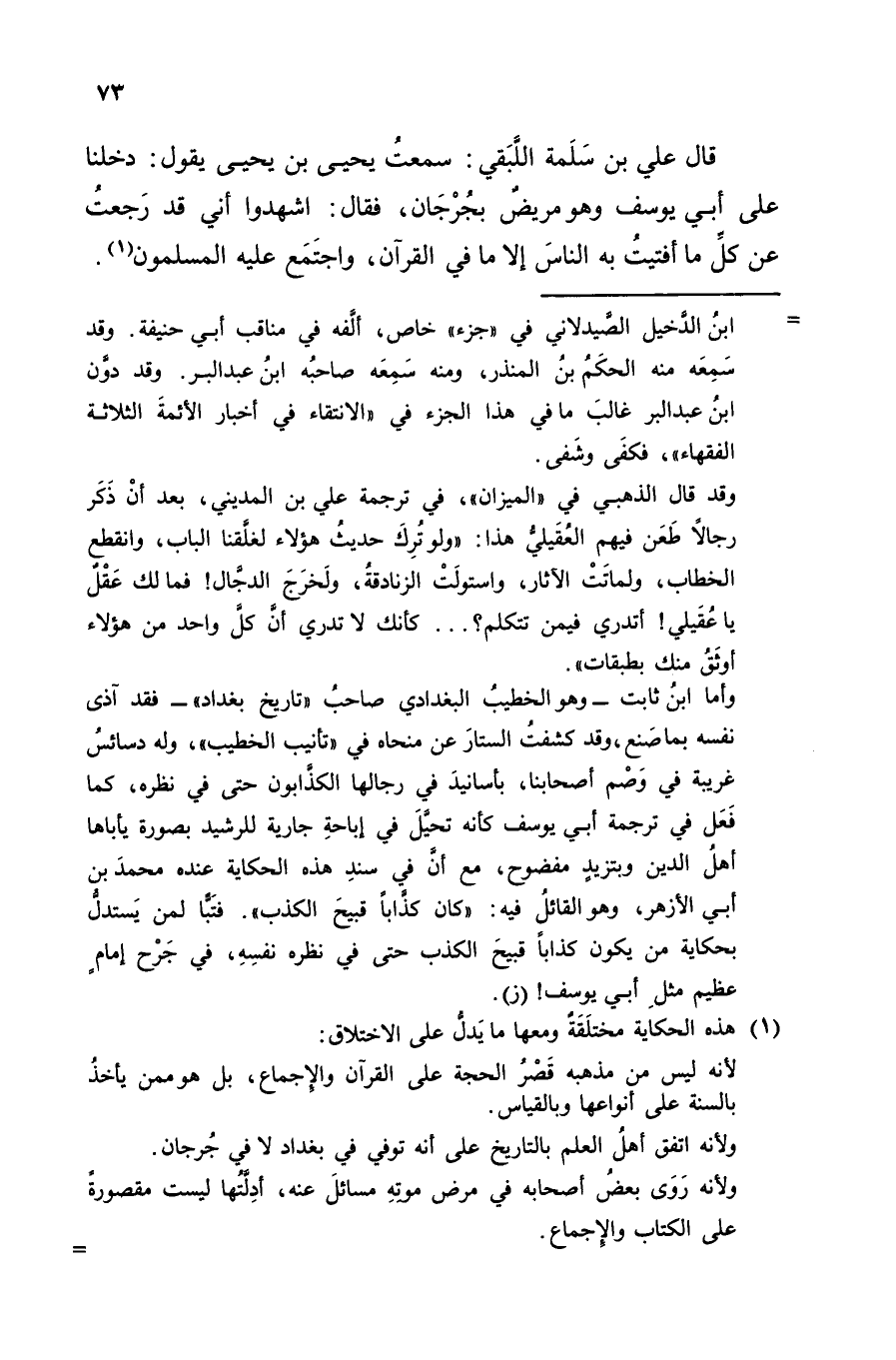 قَالَ عَلِيُّ بْنُ سَلَمَةَ اللَّبْقِيُّ: سَمِعْتُ يَحْيَى بْنَ يَحْيَى، يَقُولُ: دَخَلْنَا عَلَى أَبِي يُوسُفَ وَهُوَ مَرِيضٌ بِجُرْجَانَ، فَقَالَ: «اشْهَدُوا أَنِّي قَدْ رَجِعْتُ عَنْ كُلِّ مَا أَفْتَيْتُ بِهِ النَّاسَ، إِلا مَا فِي الْقُرْآنِ، وَاجْتَمَعَ عَلَيْهِ الْمُسْلِمُونَ»