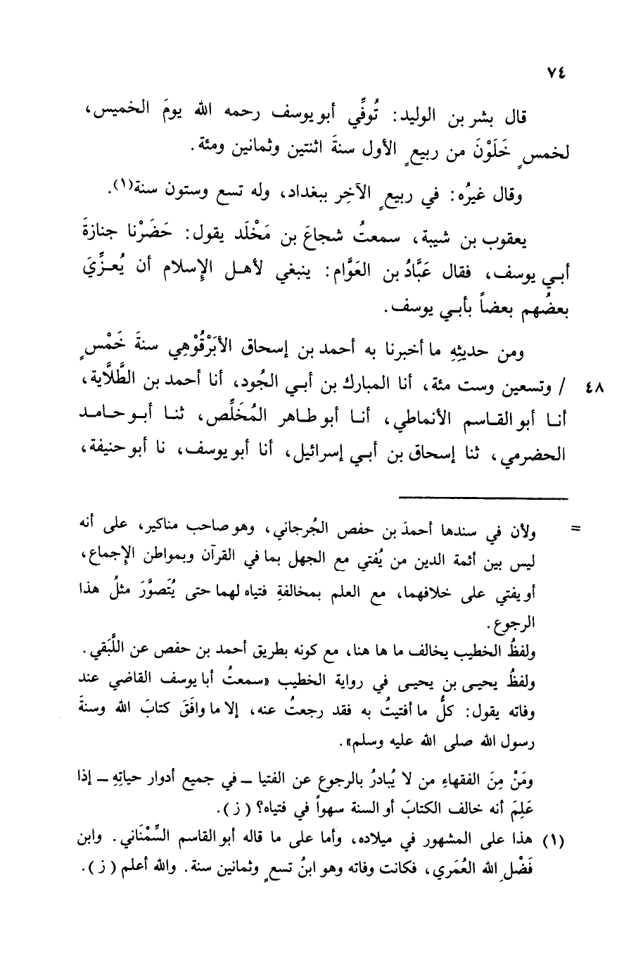 يَعْقُوبُ بْنُ شَيْبَةَ، سَمِعْتُ شُجَاعَ بْنَ مُخَلَّدٍ، يَقُولُ: «حَضَرْنَا جِنَازَةَ أَبِي يُوسُفَ»