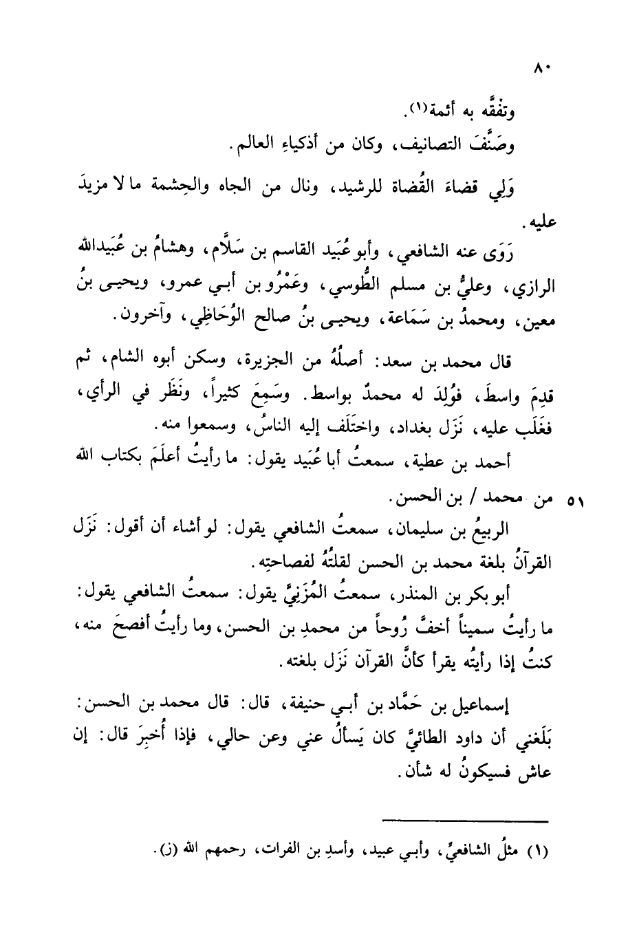 أَبُو بَكْرِ بْنُ الْمُنْذِرِ، سَمِعْتُ الْمُزَنِيَّ، يَقُولُ: سَمِعْتُ الشَّافِعِيَّ، يَقُولُ: «مَا رَأَيْتُ سَمِينًا أَخَفَّ رُوحًا مِنْ مُحَمَّدِ بْنِ الْحَسَنِ، وَمَا رَأَيْتُ أَفْصَحَ مِنْهُ، كُنْتُ إِذَا رَأَيْتُهُ يَقْرَأُ كَأَنَّ الْقُرْآنَ نَزَلَ بِلُغَتِهِ»