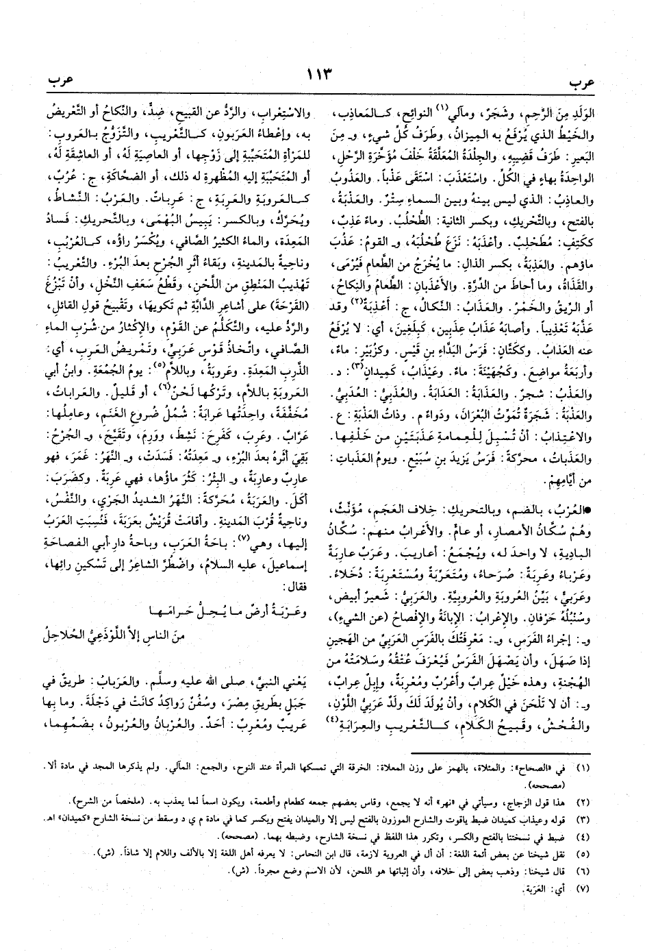 والتَّعْريبُ: تَهْذيبُ المَنْطِقِ من اللَّحْنِ، وقَطْعُ سَعَفِ النَّخْلِ، وأنْ تَبْزُغَ (القَرْحَةَ) على أشاعِرِ الدَّابَّةِ ثم تَكويهَا، وتَقْبيحُ قولِ القائلِ، والرَّدُّ عليه، والتَّكَلُّمُ عن القَوْمِ، والإِكْثارُ من شُرْبِ الماءِ الصَّافي، واتِّخاذُ قَوْسٍ عَرَبِيٍّ،