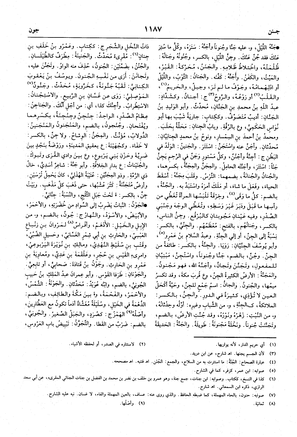 والجِنِّيُّ، بالكسرِ: نِسْبَةٌ إلى الجِنِّ، أو إلى الجِنَّةِ. وعبدُ السَّلامِ بنُ عَمْرٍو، وأبو يُوسُفَ الجِنِّيَّانِ: رَوَيَا.
